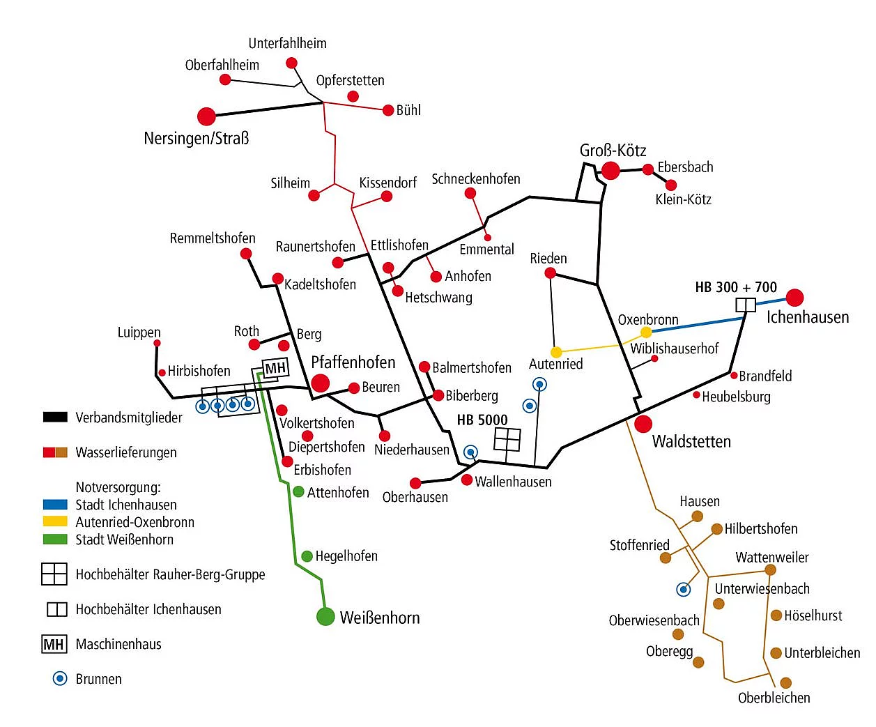 Die Wasserlieferung beginnt bei der Brunnenanlage in Pfaffenhofen (Flur Volkertshofen) mit dem Wassereinzug aus 4 Brunnen, welche mit 6 elektrischen Pumpen verschiedener Leistungsstärke bestückt sind. Dieses Wasser wird im Maschinenhaus an der Holzschwanger Straße in Pfaffenhofen der Aufbereitungsanlage zugeführt, gefiltert und mit Sauerstoff angereichert.
