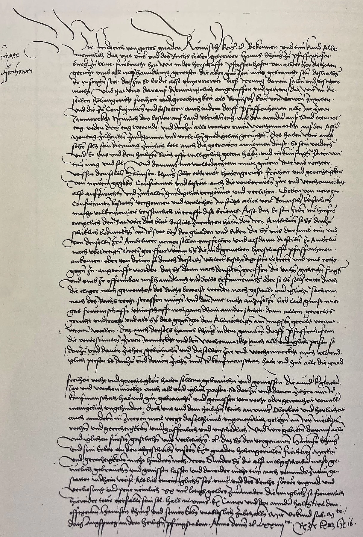 Friedrich III. bestätigt „auf Ansuchen des Hanns Ehinger zu Pfaffenhofen, Bürgers zu Ulm, der Herrschaft Pfaffenhofen die hohen Gerichte und erlaubt ihm (als neue Freyheit), im Dorfe Pfaffenhofen 2 Jahrmärkte (St. Ulrichstag und St. Otmarstag), jeden von 3 Tagen, und einen Wochenmarkt, alle Dienstag, zu halten. Pön 20 Mark Goldes.“