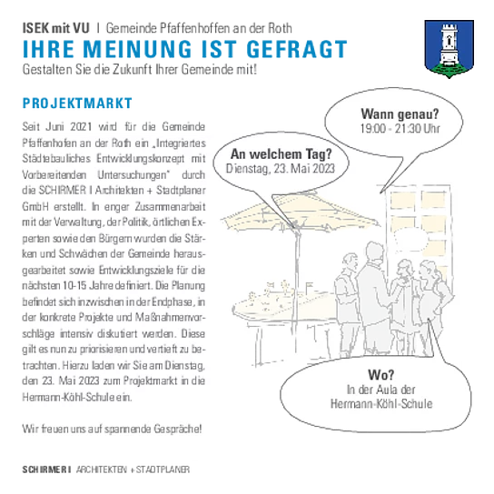 Seit Juni 2021 wird für die Gemeinde Pfaffenhofen an der Roth ein „Integriertes Städtebauliches Entwicklungskonzept mit Vorbereitenden Untersuchungen“ durch die SCHIRMER I Architekten + Stadtplaner GmbH erstellt. In enger Zusammenarbeit mit der Verwaltung, der Politik, örtlichen Experten sowie den Bürgerinnen und Bürgern wurden die Stärken und Schwächen der Marktgemeinde herausgearbeitet sowie Entwicklungsziele für die nächsten 10-15 Jahre definiert. Die Planung befindet sich inzwischen in der Endphase, in der konkrete Projekte und Maßnahmenvorschläge intensiv diskutiert werden. Diese gilt es nun zu priorisieren und vertieft zu betrachten. Hierzu laden wir Sie zum Projektmarkt
