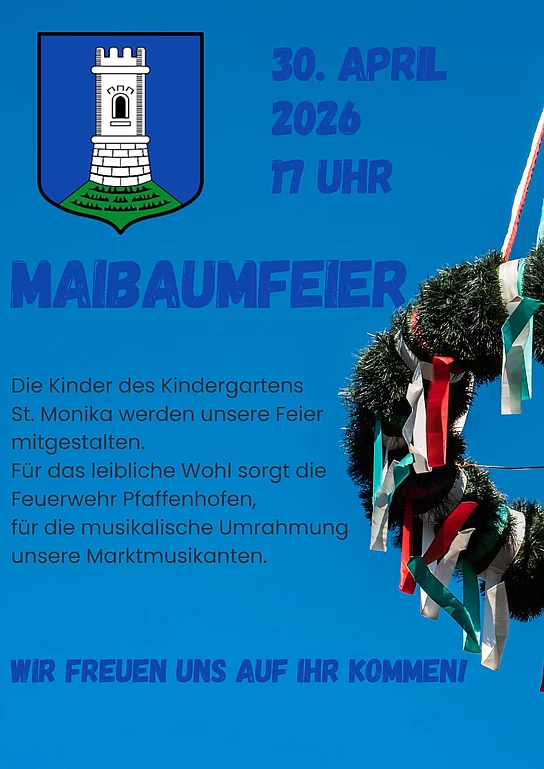 statt. Die Kinder des Kindergartens St. Monika werden unsere Feier mitgestalten. Für das leibliche Wohl sorgt die Feuerwehr Pfaffenhofen, für die musikalische Umrahmung unsere Marktmusikanten. Auch in den Ortsteilen werden durch die ortsansässigen Vereine wieder Maibäume aufgestellt. Hier bitten wir, die Veröffentlichung der jeweiligen Vereine zu beachten.