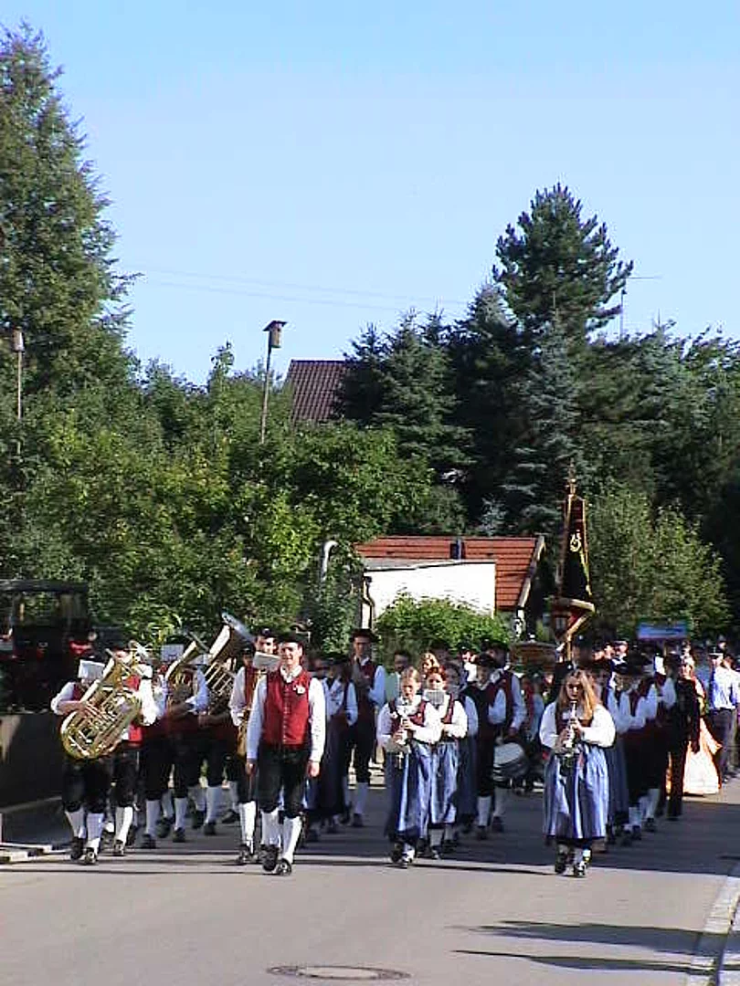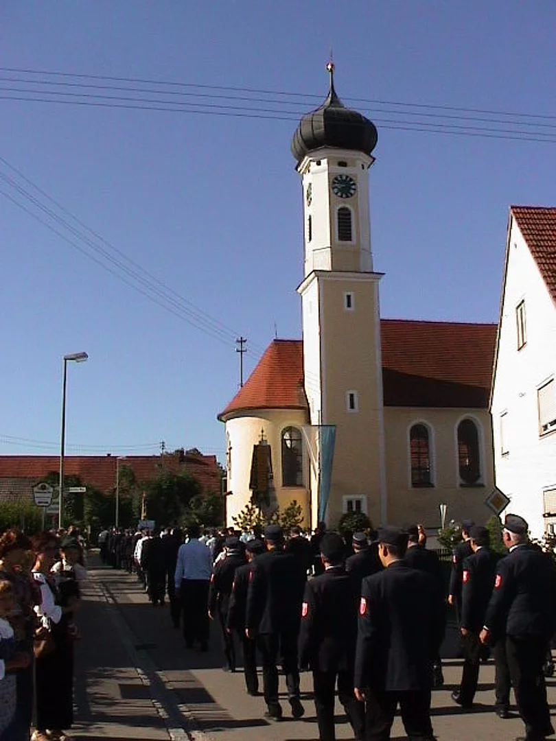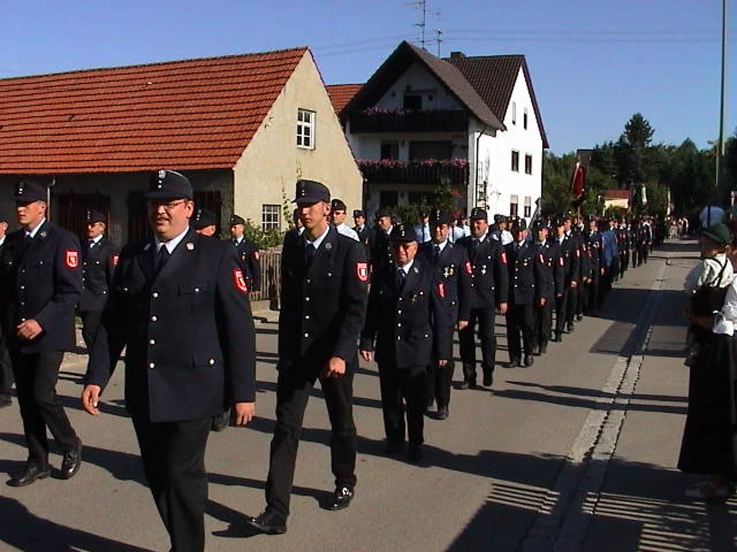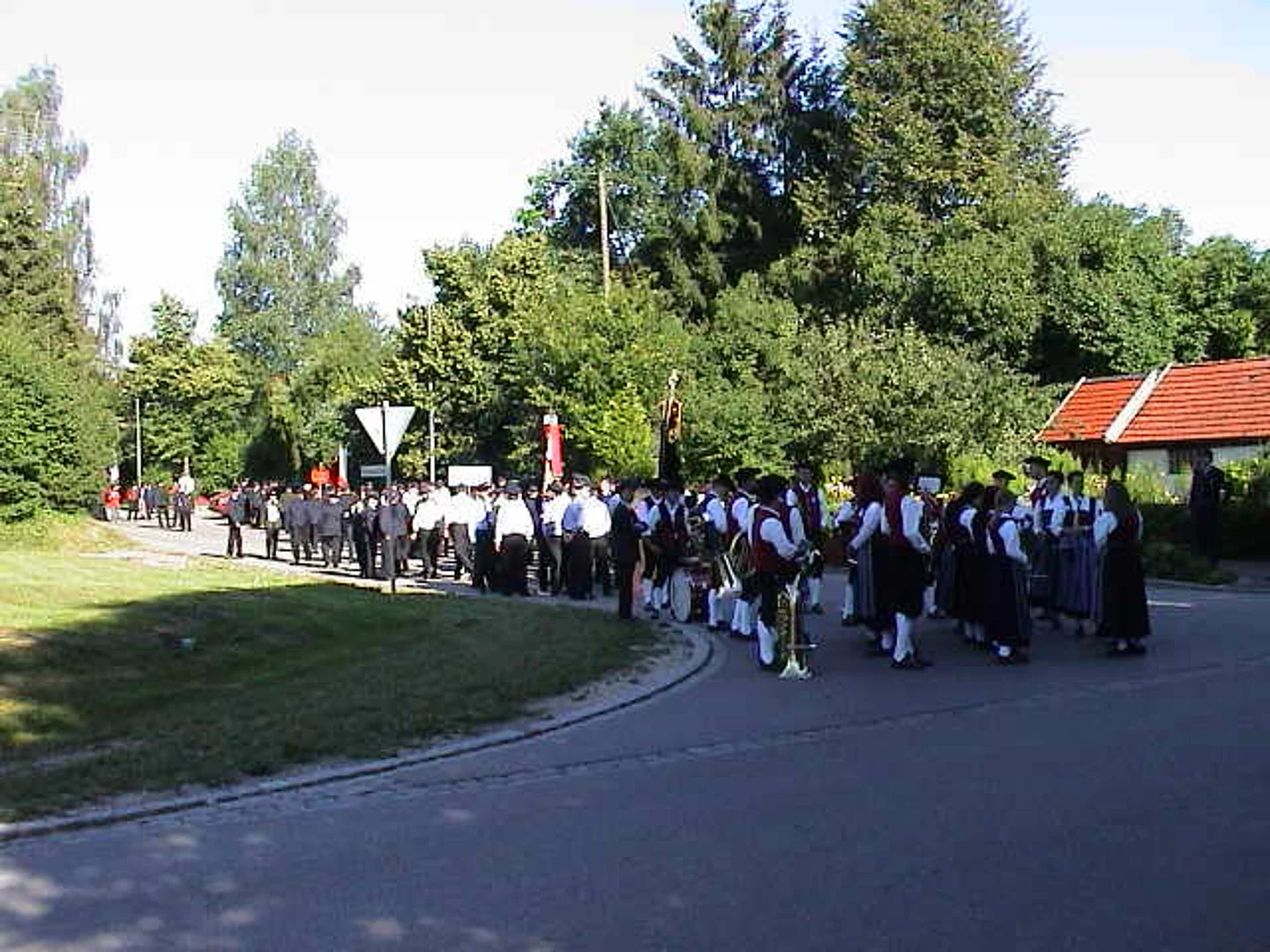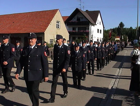 Am Sonntagmorgen ging es dann im großen Festzug zum Festplatz auf dem der Festgottesdienst von Pfarrer Georg Egger zelebriert wurde. Anschließend blieben die Kirchgänger gleich zum Frühschoppen und Gartenfest sitzen und feierten gut gelaunt bei bestem Wetter das Jubiläum mit Gästen aus nah und fern, wie zum Beispiel der befreundeten Freiwilligen Feuerwehr aus Niederhausen in Niederbayern.
