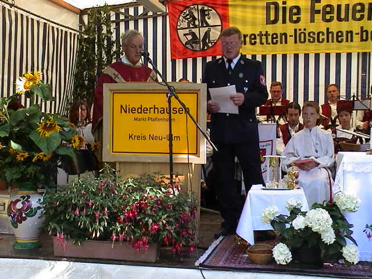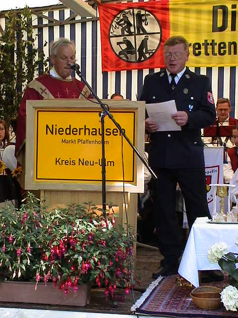 Mit Festakt und Dorffest feierte die Freiwillige Feuerwehr Niederhausen ihr 125jähriges Bestehen. Zum Festakt am Samstag konnten zahlreiche Repräsentanten der Feuerwehren, der Vereine und des öffentlichen Lebens begrüßt werden. "Heute ist ein Ehrentag für die Freiwillige Feuerwehr Niederhausen". sagte der Vorsitzende des Feuerwehrvereins, Johann Merkle bei seiner Begrüßung. Johann Merkle wurde bereits im Jahre 1963 Kommandant der Wehr. Dieses Amt hatte er 30 Jahre inne. 12 Jahre war er stellvertretender Kommandant. Nun ist er seit 5 Jahren Ehrenkommandant. Den Vorsitz des Feuerwehrvereins hat er seit 25 Jahren inne. Diese Leistung würdigte Bürgermeister Josef Walz in seinem Grußwort mit den Worten "Ein Leben für und mit der Feuerwehr". Er hob weiterhin den Einsatz der Feuerwehren für das Gemeinwohl hervor. Besonders würdigte er die Impulse, die von der Freiwilligen Feuerwehr Niederhausen für den Zusammenhalt der örtlichen Dorfgemeinschaft ausgingen. Das beste Beispiel dafür ist der Bau des neuen Feuerwehrgerätehauses im Jahre 1981 mit dem angegliederten Dominikusstüble, das sich die Feuerwehr in Eigenleistung geschaffen hat. Landrat Erich Josef Geßner zeigte die gesellschaftlichen Veränderungen in der Zeitspanne von 125 Jahren auf. Besonders erwähnte er, dass in Niederhausen von 200 Einwohnern 28 aktive Feuerwehrleite seien. Dahinter könne sich jede Großstadt verstecken, meinte er. Kreisbrandrat Alfred Raible warnte davor, die kleinen Wehren zu belächeln. Ihr großer Vorteil sei die Ortskenntnis. Zudem könne auf die Personalreserve dieser Wehren nicht verzichtet werden. Kommandant Hubert Windeisen brachte es in seiner Ansprache auf den Punkt. In 125 Jahren seien Sinn und Zweck der Feuerwehr gleich geblieben: Gegenseitige Hilfe ohne lang zu fragen. Mit dem Feuerwehr-Ehrenzeichen in Silber für 25 Jahre aktiven Einsatz wurden von Landrat Geßner Karl-Heinz Beck, Helmut Renz und Erhard Zahn ausgezeichnet.