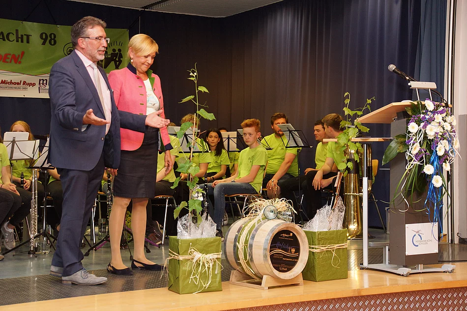 Den Schlusspunkt des offiziellen Programms setzte Bürgermeisterin Ursula Brauchle. Sie bezeichnete die VG-Gründung als guten Deal für beide Seiten. Sie hob hervor, dass es kein Prioritätengerangel gäbe, die beiden Gemeinden seien Partner auf Augenhöhe. Sie beließ es nicht nur bei Dankesworten, nein, sie hatte auch Präsente für den Markt Pfaffenhofen mitgebracht. Ein schönes Fass Wein und zwei Weinreben für den Ortsgarten konnte sie dem erfreuten VG-Chef Walz überreichen, der sich herzlich bedankte.