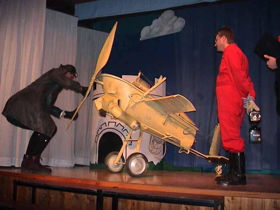 Krönender Abschluss war der Auftritt von "Jakob Adler" dem tollkühnen Flieger. Mit seiner fabelhaften Flugmaschine, gebastelt aus einer alten Blechbadewanne, Spaten, Wagenbremse, Spaten, Ofenrohr und sonstigen Blechteilen verspricht er eine spannende Saalrunde zu fliegen, bei der höchstens zwei oder drei aus dem Publikum draufgehen würden. Dass dann letztlich doch alle Anwesenden mit dem Leben davon kamen, war diversen Startschwierigkeiten und dem beherzten Eingreifen des Sicherheitsbeauftragten des Theaters zu verdanken.