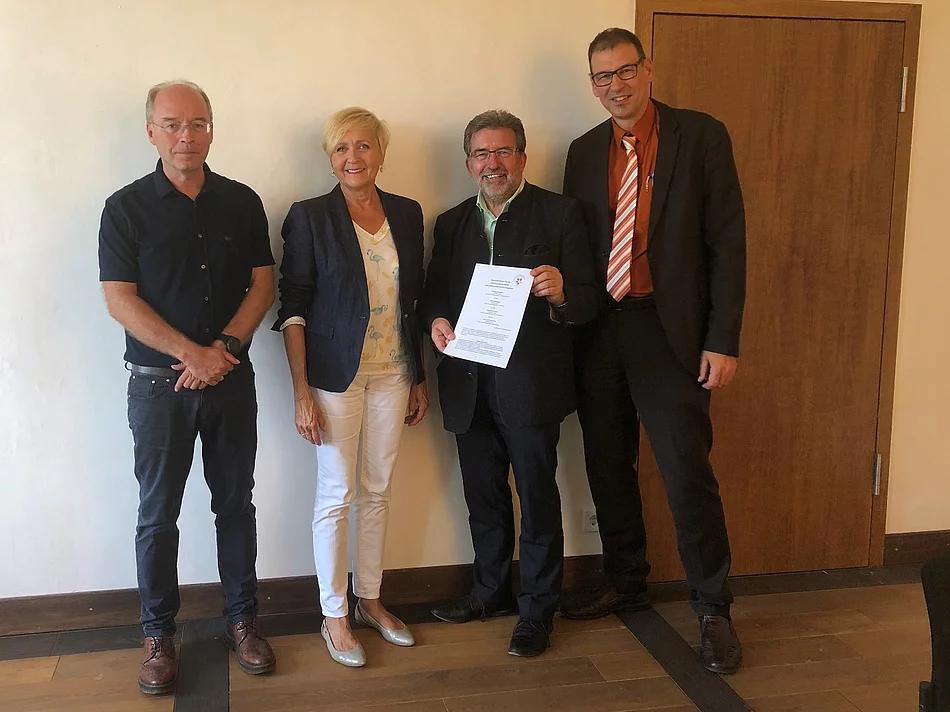 Die Bürgermeister der Stadt Weißenhorn Dr. Wolfgang Fendt, des Marktes Pfaffenhofen Josef Walz, der Gemeinde Roggenburg Mathias Stölzle und die Bürgermeisterin der Gemeinde Holzheim Ursula Brauchle haben sich im Weißenhorner Rathaus getroffen und eine Zweckvereinbarung über die Einrichtung eines gemeinsamen Familienstützpunktes unterzeichnet.