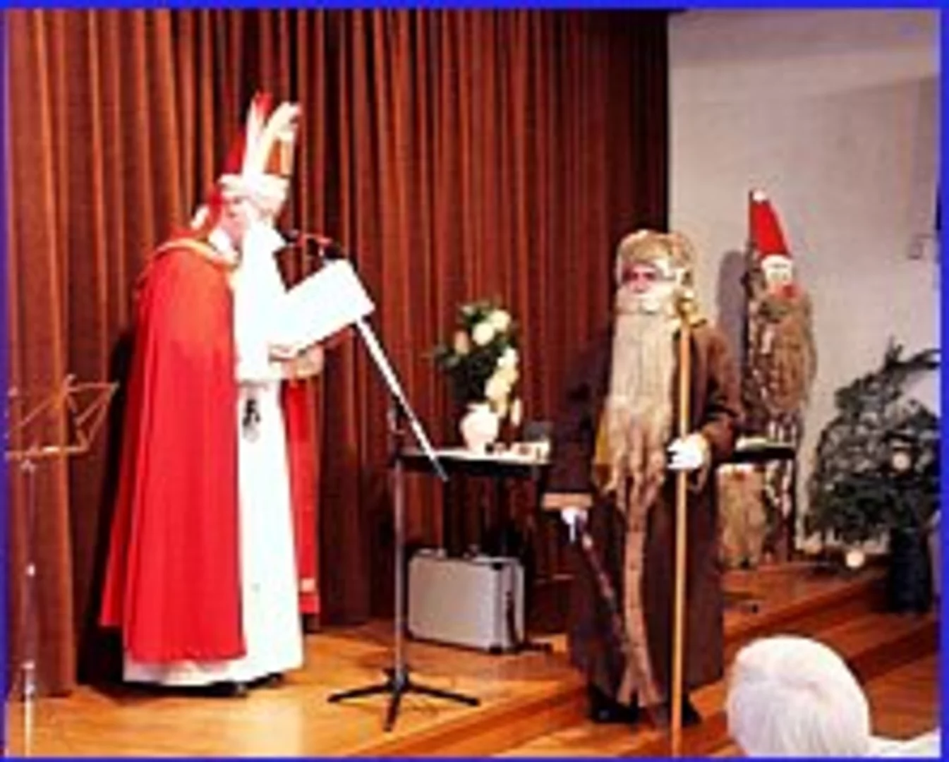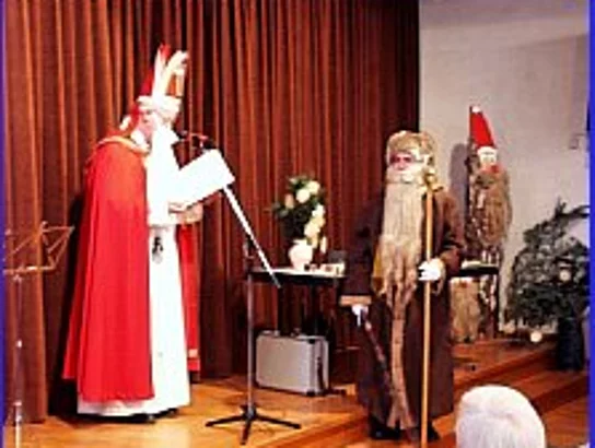Die Gitarrengruppe spielte in der Zwischenpause und als Anja Burkhardt ihre Lesung beendete waren die Anwesenden so überwältigt, daß sie vor lauter Betroffenheit nicht applaudieren konnten. Als sich die Autorin dann verabschiedete gab es tosenden Applaus im Saal. Zur Stärkung gab es Kaffee, selbstgebackene Plätzchen und Stollen. Die Gitarrengruppe wurde nach der Pause von 3 Jugendlichen verstärkt und gemeinsam luden sie die Senioren zum Singen ein. Plötzlich wurde es ganz still im Saal. St. Nikolaus und Knecht Ruprecht besuchten die Senioren. St. Nikolaus (Pfarrer Georg Egger) lobte die Senioren und die Leitung und alle Helfer des Seniorenkreises für die Jahresarbeit. (11Seniorennachmittage, 2 Ausflüge, die Krippenfahrt und die Ulrichswallfahrt). Alle Helferinnen und Helfer, voran Frau Helga und Herr Konrad Stölzle, erhielten vom Nikolaus ein Buch von Anja Burkhardt (Flügelschläge der Seele oder Quellen der Lebendigkeit). Knecht Rupprecht (Bürgermeister Josef Walz aus Pfaffenhofen) dankte den Senioren, daß sie das Angebot der Pfarrei so gut annehmen und dankte allen, die sich aktiv, ehrenamtlich für andere einsetzen. Nach dem Nikolausbesuch wurden noch einige Adventslieder gesungen und mit einem Grußwort von Herrn Pfarrer Egger endete gegen 16.45 Uhr die Feier.
