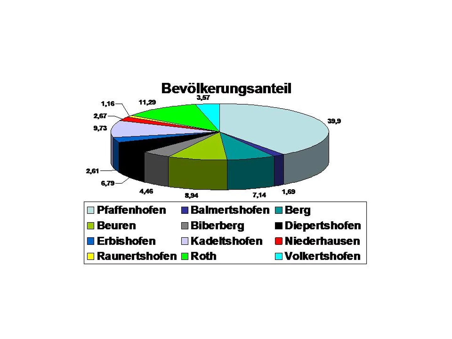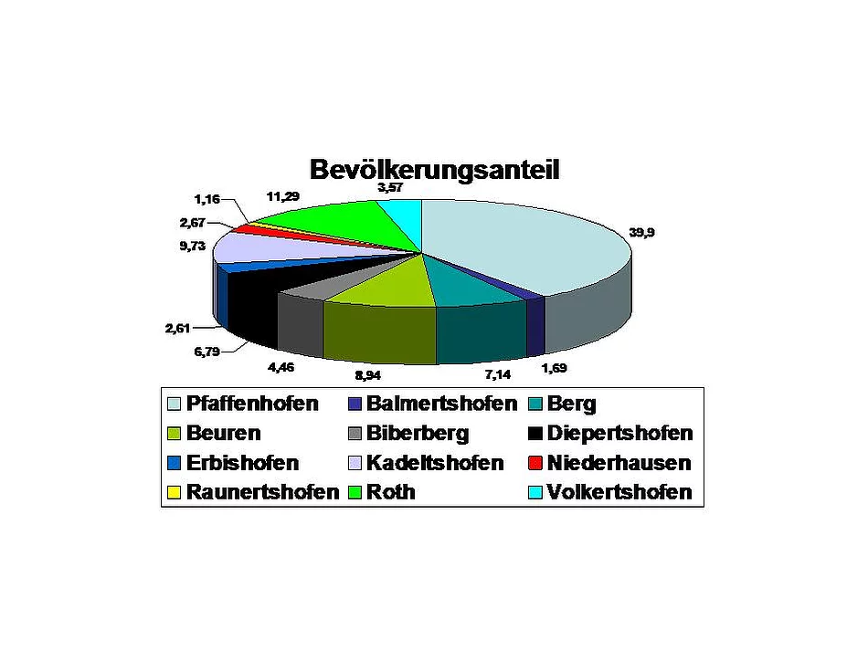 Das Einwohnerwachstum in Pfaffenhofen hat sich verlangsamt. Das zeigen die neuen Einwohnerzahlen mit Stand 1.1.2006 deutlich. Die Männer sind in Pfaffenhofen leicht in der Überzahl. Es gibt nur drei Ortsteile mit Frauenüberschuss, in Biberberg lebt eine Frau mehr als Männer, in Raunertshofen sind es drei und in Roth zwei. Der größte Ortsteil ist der Kernort Pfaffenhofen mit 2854 Einwohnern, der kleinste Raunertshofen mit 83. Der Anteil an Jugendlichen unter 18 Jahren ist in Volkertshofen am höchsten. Er beträgt dort stolze 31,25 Prozent. Am niedrigsten ist er mit 10,84 % in Raunertshofen, gefolgt von Niederhausen mit 17,27 %. Die anderen Ortsteile liegen dicht gedrängt zwischen 20,7 % und 25,7 %. Volkertshofen hat nicht nur den höchsten Anteil an Jugendlichen sondern auch den geringsten Anteil an Senioren (65 Jahre und älter) nämlich 11,23 % dicht gefolgt von Biberberg mit 11,9 %. Die größte Seniorendichte weist Raunertshofen mit 26,5 % auf. Das heißt jeder vierte Einwohner dort ist 65 Jahre und älter. Weit abgeschlagen folgt Pfaffenhofen mit 16,85 % Senioren. Im Gesamtdurchschnitt im Marktbereich sind es 15,14 %. Im Bundesdurchschnitt sind es immerhin 18,62 %. Der Anteil der Kinder unter 6 Jahren beträgt im Marktbereich 5,81 % im Vergleich zur Bundesrepublik mit 5,37 %.