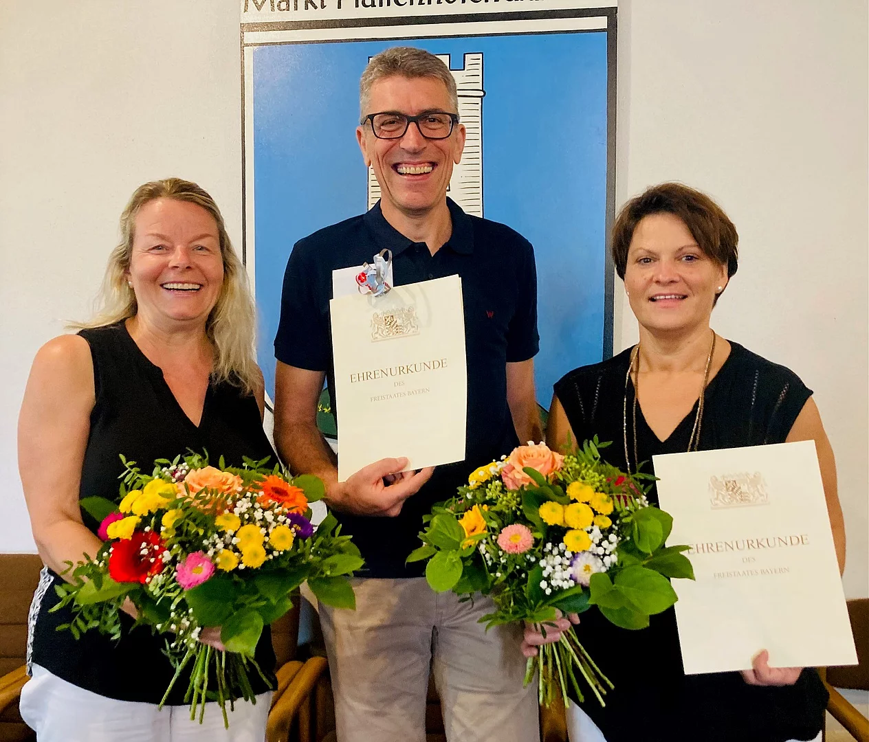 Im Rahmen einer kleinen Jubilarfeier im Ratssaal bedankten sich die Bürgermeister Dr. Sebastian Sparwasser und Thomas Hartmann bei Herrn Müller, Frau Bertele und Frau Schmid für ihre langjährige und treue Mitarbeit und gratulierten ihnen zu den besonderen Dienst- und Arbeitsjubiläen. Bei den Feierlichkeiten wurden den Jubilaren auch die Ehrenurkunden für langjährige Dienstzeiten des Bayerischen Staatsministerium für Familie, Arbeit und Soziales überreicht.