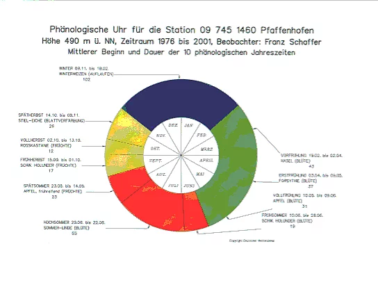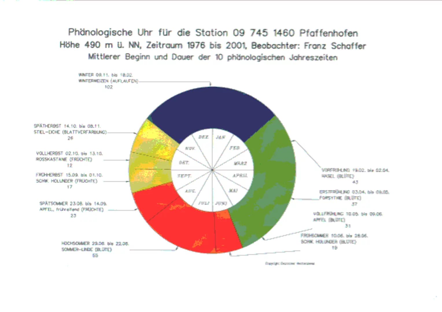 Verlauf über mehrere Jahrzehnte zu erfassen. Mit Hilfe solcher mittleren Eintrittszeiten kann man nämlich die Klimagunst eines bestimmten Gebietes beurteilen und zum Beispiel abschätzen, ob in einer bestimmten Höhenlage noch Mais angebaut werden kann. Weil Pflanzen eben die billigsten Messinstrumente für die jeweilige Witterung oder Klima sind, hat der Deutsche Wetterdienst schon vor einigen Jahrzehnten ein sogenanntes phänologisches Messnetz eingerichtet. Zur Zeit stellen etwa 1600 ehrenamtliche Beobachter während der Vegetationszeit etwa 1 bis 2 mal pro Woche das Wachstum von mehr als 50 Pflanzenarten und ca. 160 Entwicklungsphasen wie Blattentfaltung, Blüte, Reife usw. fest und geben diese Beobachtungen entweder sofort oder in einem Jahresbogen an das Zentralamt des Deutschen Wetterdienstes weiter, wo die Daten in einem Großrechner weiterverarbeitet werden. Der große Nutzen dieser Beobachtungen liegt zunächst einmal bei der aktuellen