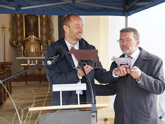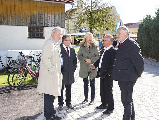 Hoher Besuch hatte sich auf den Weg in den kleinen Pfaffenhofener Ortsteil Diepertshofen gemacht um an der Einweihung des neuen Dorfplatzes teilzuhaben. Die bayrische Europaministerin Beate Merk und der bayrische Europaabgeordnete Markus Ferber ließen es sich nicht nehmen in Augenschein zu nehmen was mit den Zuschüssen der EU hier neu entstanden ist. 135 000 Euro hatte diese im Rahmen des Europäischen Landwirtschaftsfonds für die Entwicklung des ländlichen Raums (ELER) von den Gesamtkosten von 320000 Euro getragen. Der Platz ist in den vergangenen Monaten völlig umgestaltet worden: Quader und Bänke zum Sitzen sind vor der Kapelle St. Ulrich aufgestellt worden. Bislang gab es hier lediglich eine Durchgangsstraße mit einer Rasenfläche und einer Linde. Neu ist ebenfalls eine große Rampe für das barocke Kirchlein, Menschen mit Gehbehinderungen können die St. Ulrichskapelle nun besser erreichen. Der Platz vor dem „Käppele“ ist mit Pflastersteinen ausgelegt worden. Ganz neu wurde der Uferbereich neben der Rothbrücke gestaltet. Die "alte Viehtränke", so der Name, erhielt Sitzbänke, das Ufer wurde zum einen terrassiert, zum anderen zum Wasser hin abgeflacht um die Roth zum Spielen erreichbar zu machen. Als Reminsezenz an den Namen wurden zwei Metallskulpturen, die Rinder darstellen, aufgestellt.