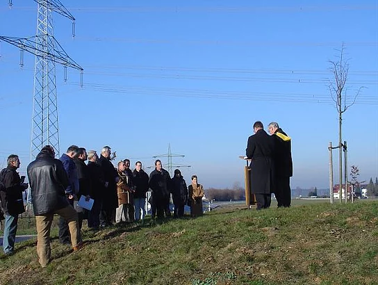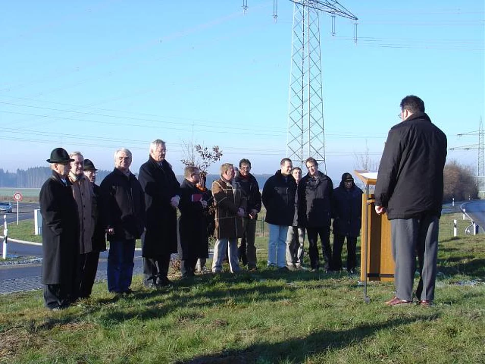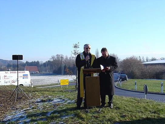 Soviel Prominenz aus dem Landkreis und der Gemeinde wie an diesem Tag dürfte sich so schnell nicht mehr auf dem Kreisel in der Mitte des Kreisverkehrs beim Lidl-Lager versammeln. Der Anlass war aber auch entsprechend, das neue Wahrzeichen Pfaffenhofens wurde gesegnet. Selbst Landrat Erich Josef Geßner gab sich die Ehre. Dass der Turm jetzt fertig sei, darauf verwies Bürgermeister Josef Walz. Entgegen der Erwartung mancher Bürger werde der Turm nicht höher. Großes Lob erntete Marktgemeinderat Christoph Engelmayer, der die Idee zum Bau dieses Turms hatte, und der auch die Bepflanzung für den Turm gestiftet hat. Ein Birnbaum wird künftig den Turm beschatten und hoffentlich reichlich Früchte tragen. Bürgermeister Josef Walz dankte auch allen Spendern, die mit ihrer Gabe den bau als Erinnerung an das Jubiläumsjahr möglich gemacht hatten. Gesegnet wurde der Turm vom katholischen Pfarrer Georg Egger und vom Pfarrer der evangelische Kirchengemeinde Andreas Erstling.