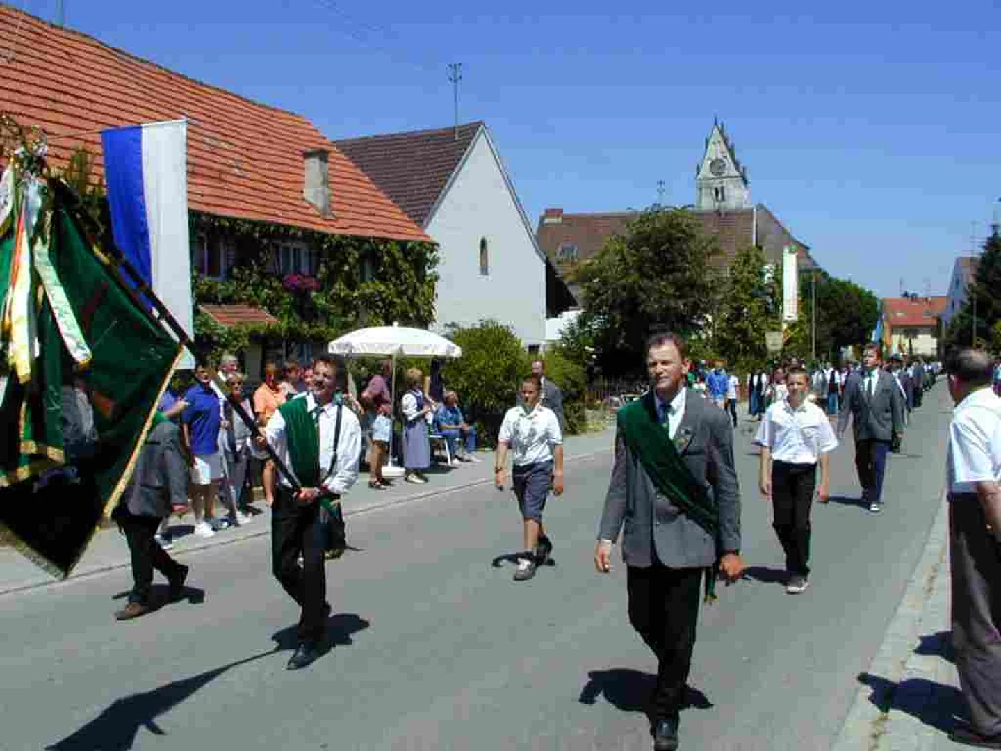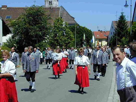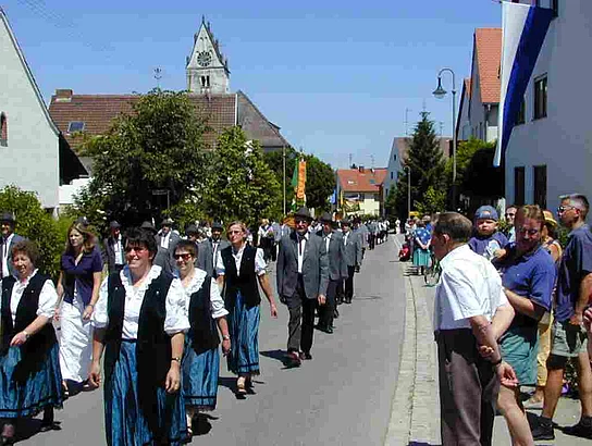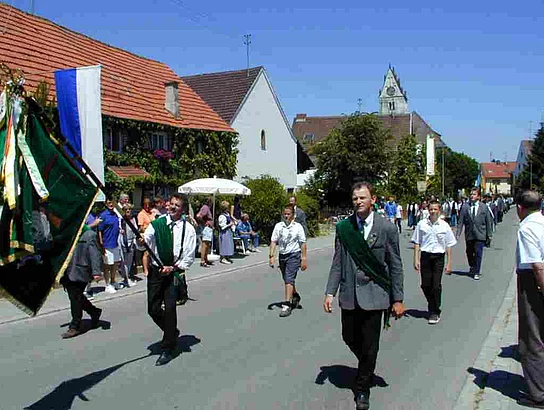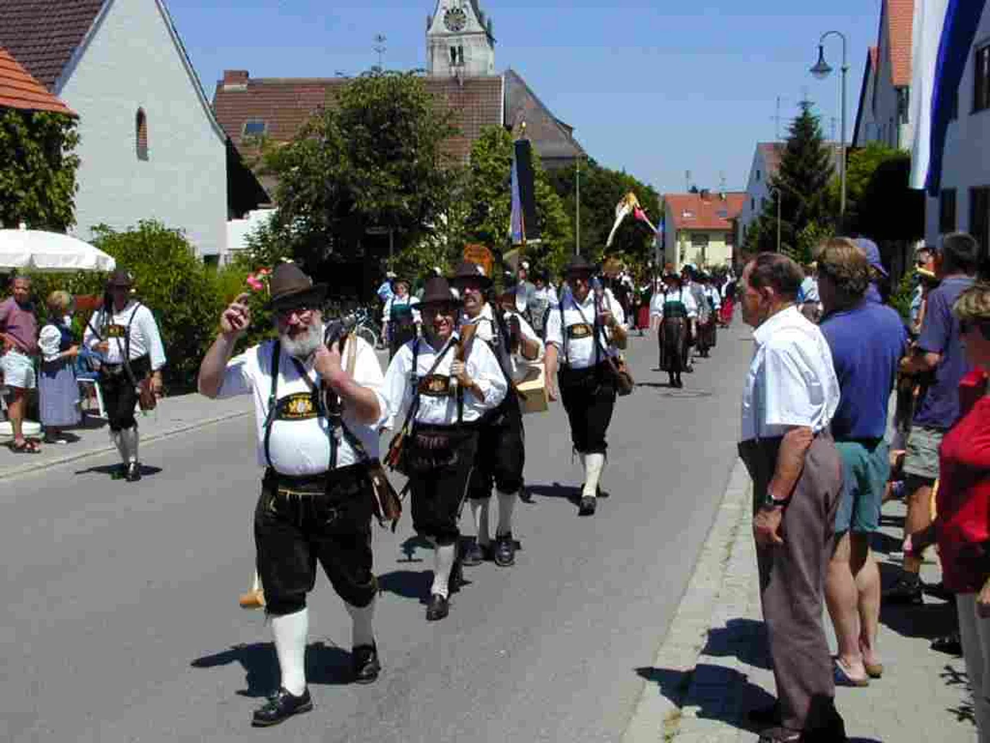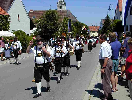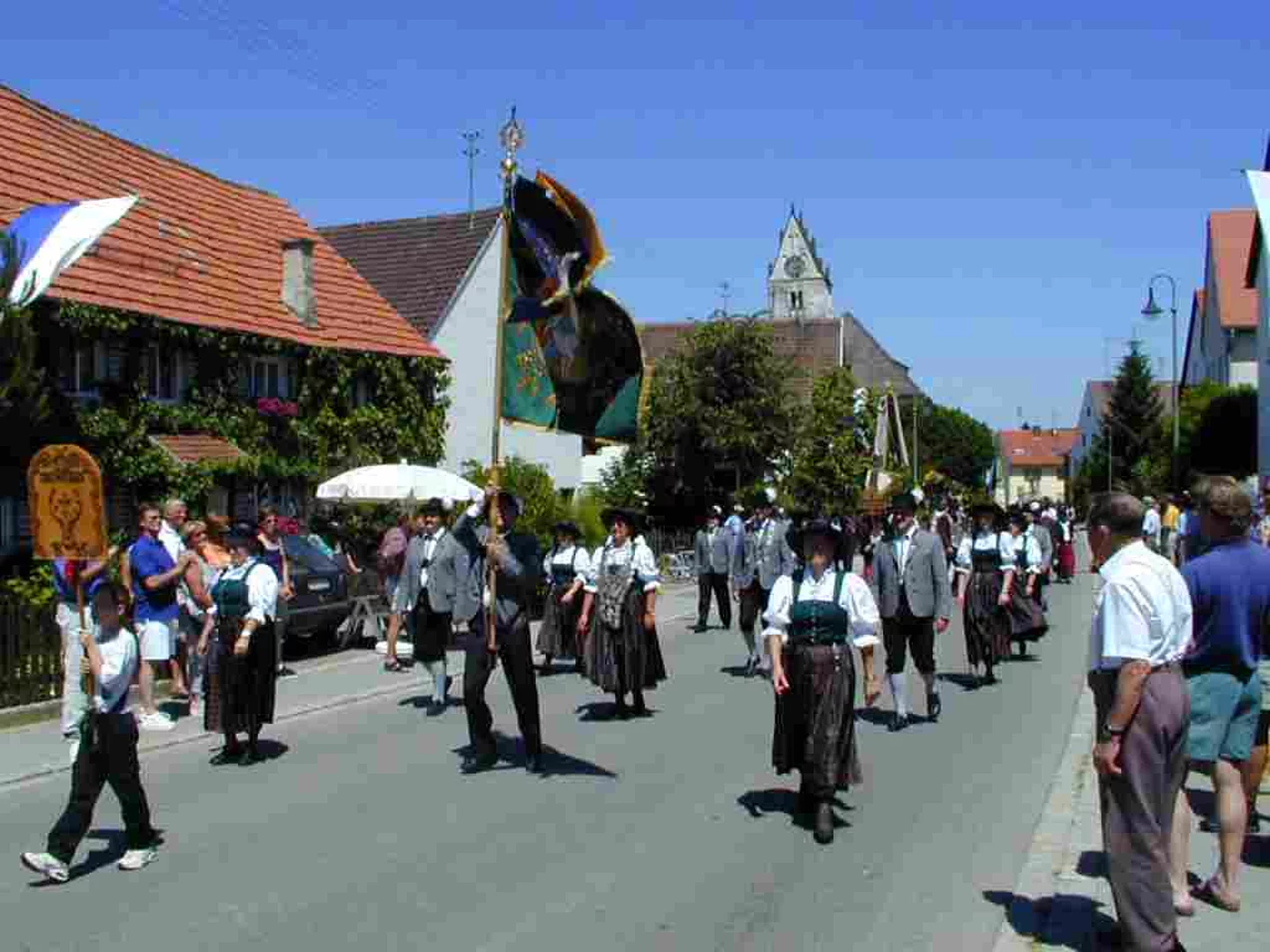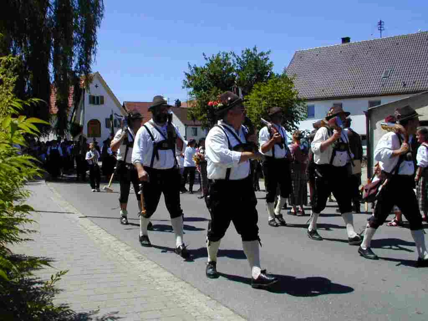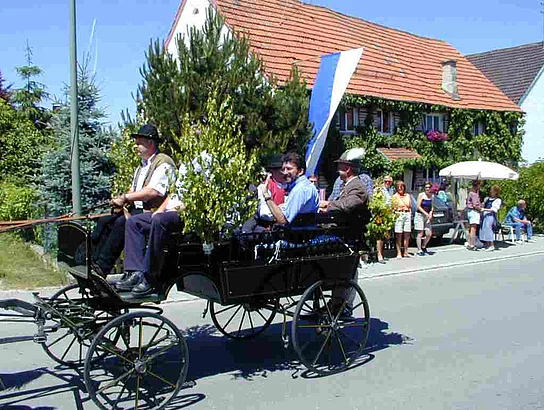 Am Nachmittag ging dann der Festumzug, der donnernd von den Böllerschützen eröffnet wurde, durchs festlich geschmückte Dorf. Bürgermeister Josef Walz war sicher froh, bei den rekordverdächtigen Temperaturen die das sonnige Wetter mit sich brachte, dass er den Umzug in einer Pferdekutsche begleiten konnte.