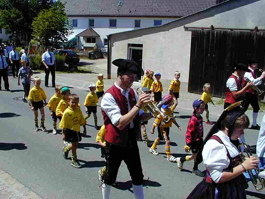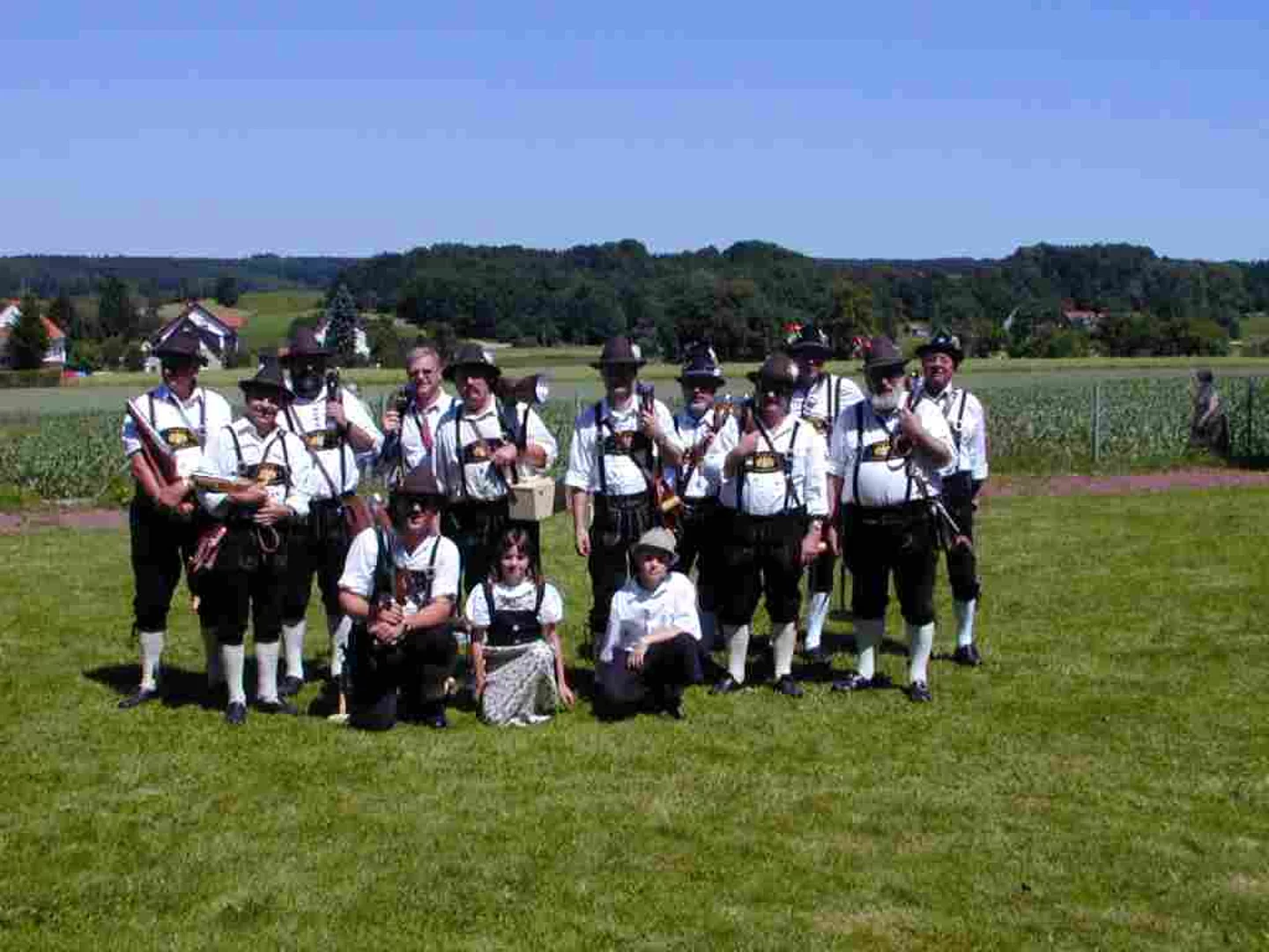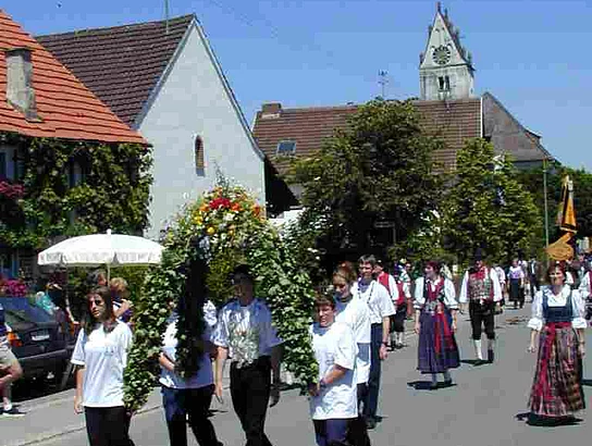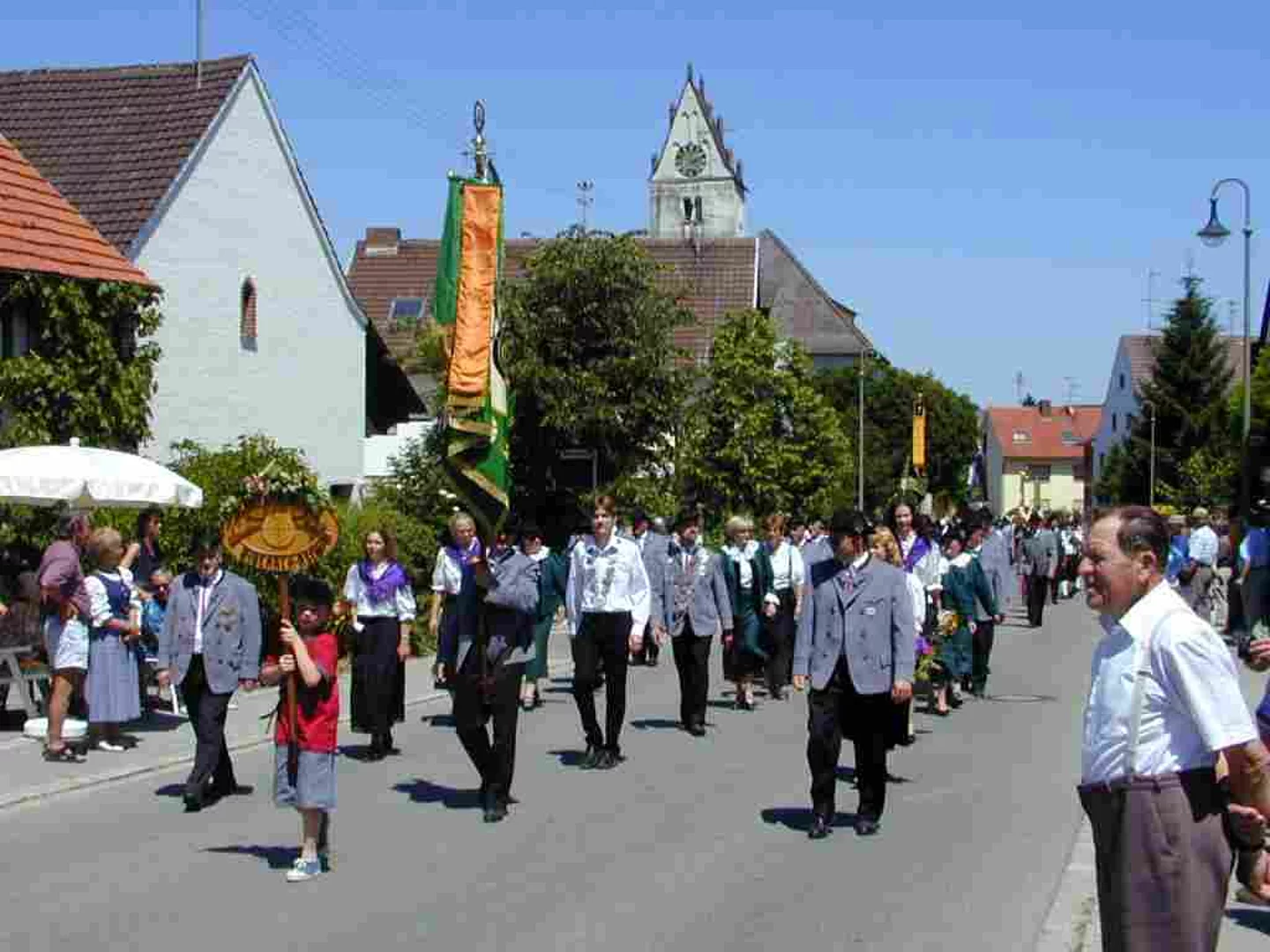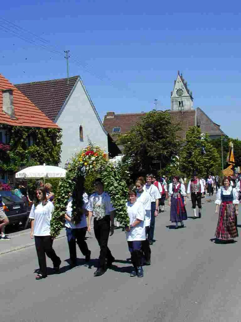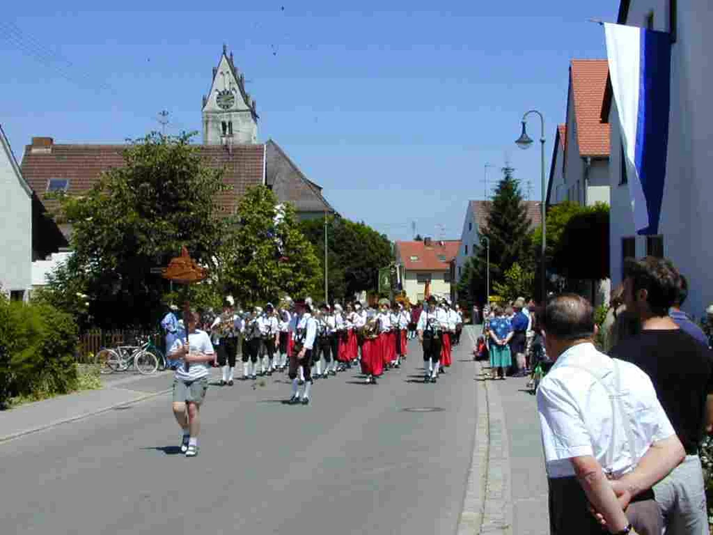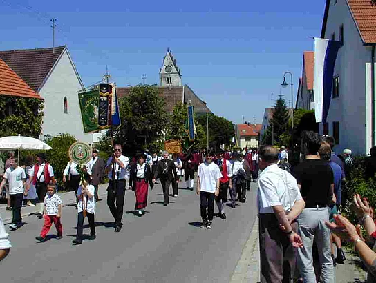 Am Nachmittag ging dann der Festumzug, der donnernd von den Böllerschützen eröffnet wurde, durchs festlich geschmückte Dorf. Bürgermeister Josef Walz war sicher froh, bei den rekordverdächtigen Temperaturen die das sonnige Wetter mit sich brachte, dass er den Umzug in einer Pferdekutsche begleiten konnte.