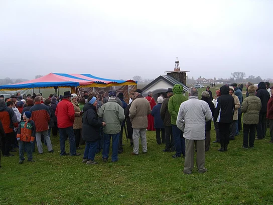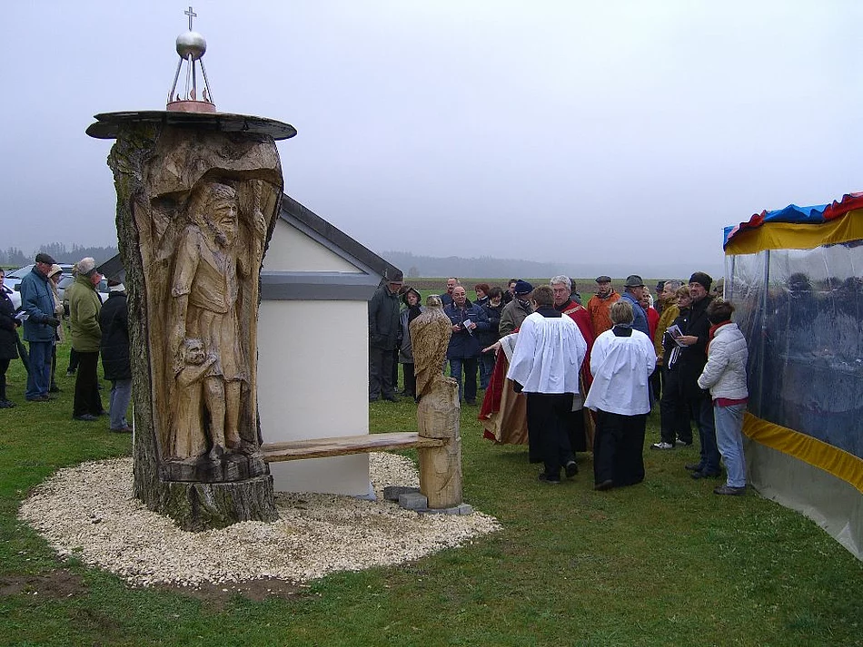 Frisch renoviert leuchtet die Feldkapelle auf der Diepertshofener Flur. Freiwillige Helfer verhalfen ihr zu neuem Anstrich. Neben ihr steht eine große holzgeschnitzte Christopherusstatue. Dass dieses Kleinod jetzt so strahle, habe der öffentlichen Hand dank dem bürgerschaftlichen Engagement keinen Euro gekostet, hob Bürgermeister Josef Walz in seiner Ansprache hervor. Einem Blitzschlag sei es zu verdanken, dass man sich jetzt zur Segnung der Feldkapelle versammelt habe, so Walz. Ein Blitzschlag hatte nämlich den mächtigen Walnussbaum getroffen, der neben der Kapelle stand, sodass sich die Gemeinde veranlasst sah, den Baum zu fällen. Das Holz sollte den Pfaffenhofenern Schnitzerfreunden überlassen werden. Als jedoch Jakob Eberle den Baum inspizierte hatte er eine andere Idee. Er bat die Gemeinde den Baumstamm bis auf eine Höhe von über zwei Metern stehen zu lassen. Dann ging er mit seiner Motorsäge ans Werk und verwandelte den Baumstumpf in St. Christopherus mit dem Jesuskind an der Hand. Diakon Edwin Rolf erbaten den Segen für die Feldkapelle, die den 14 Nothelfern gewidmet ist. Diese sind die Heiligen Blasius, Georg, Erasmus, Vitus, Achatius, Margareta, Christophorus, Panaleon, Cyrakus, Ägidius, Eustachius, Dionysius, Katharina, Barbara. Der Vereinsring hatte zur Feier des Tages ein Zelt aufgestellt, das aufgrund der vielen Besucher fast aus allen Nähten platzte. Draußen war es kalt, im Zelt gab es Kaffee und Kuchen, gestiftet und gebacken von den Frauen aus dem Ortsteil Diepertshofen. Der Erlös aus dem Verkauf kommt der Renovierung der Filialkirche St. Ulrich in Diepertshofen zugute.