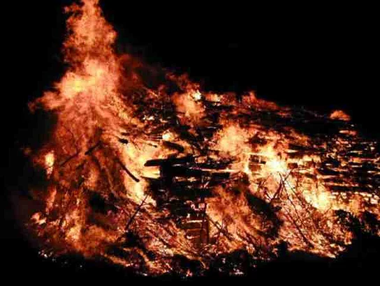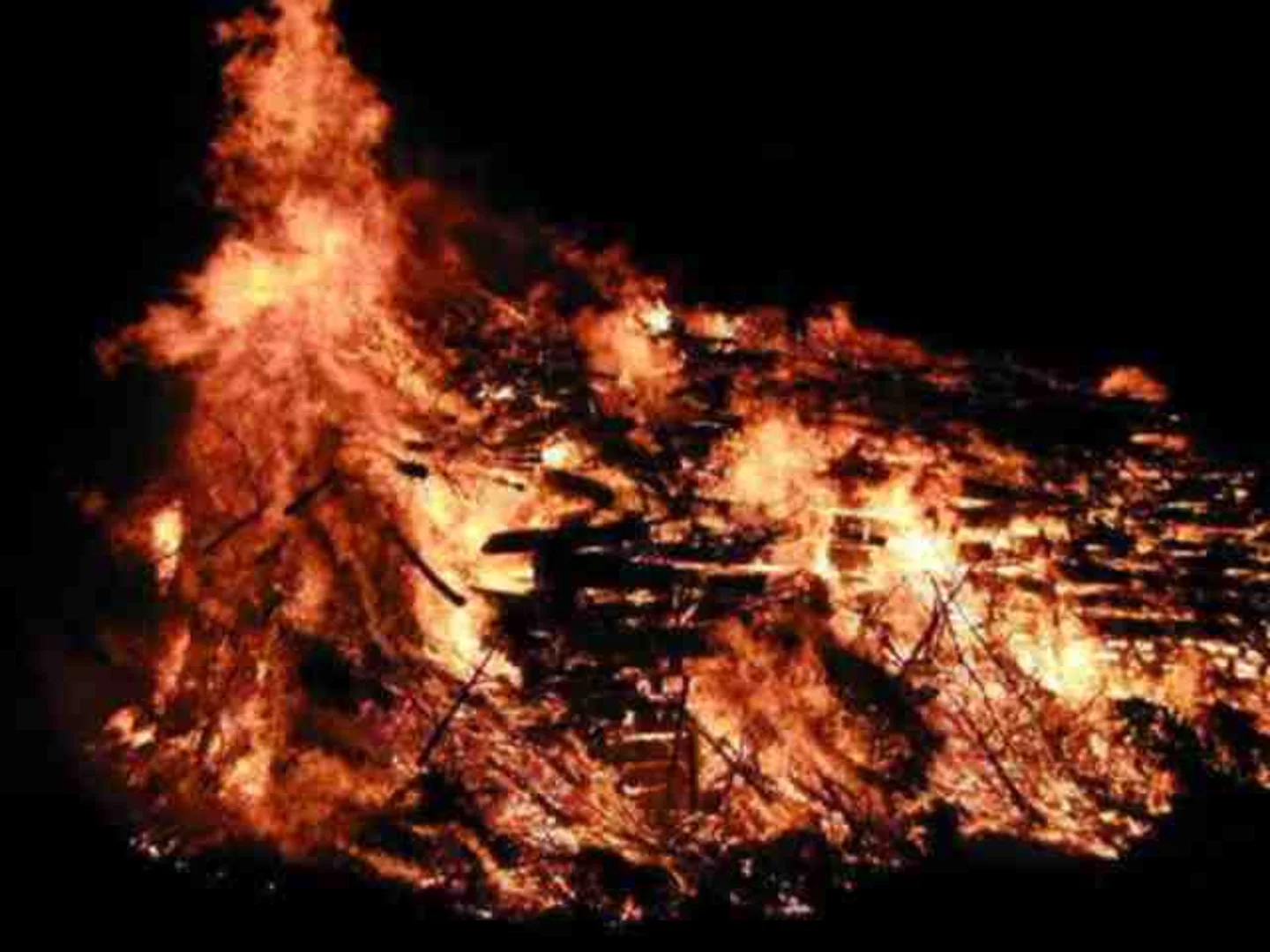 Innerhalb von wenigen Minuten brannte der Holzstoß, begünstigt durch einen leichten Westwind, lichterloh.