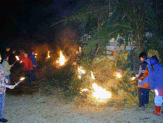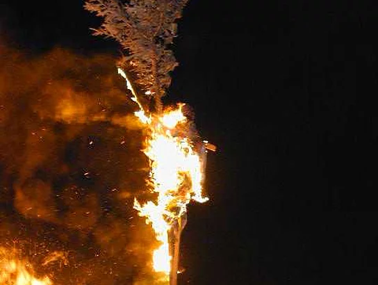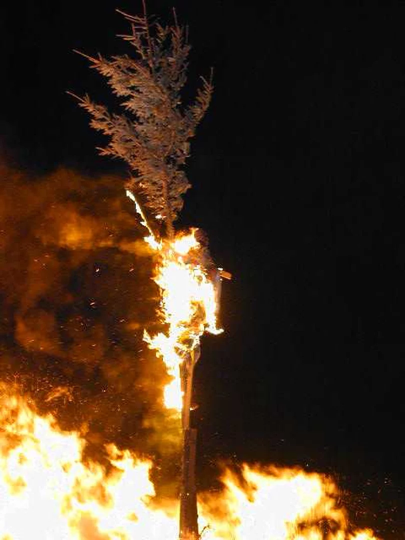 Die Flammen haben auch schnell die an einer Holzstange befestigte Strohpuppe erreicht, die mit lautem Getöse verbrannte. Symbolisch ist damit der Winter bezwungen und die Hoffnung auf den beginnenden Frühling wächst.