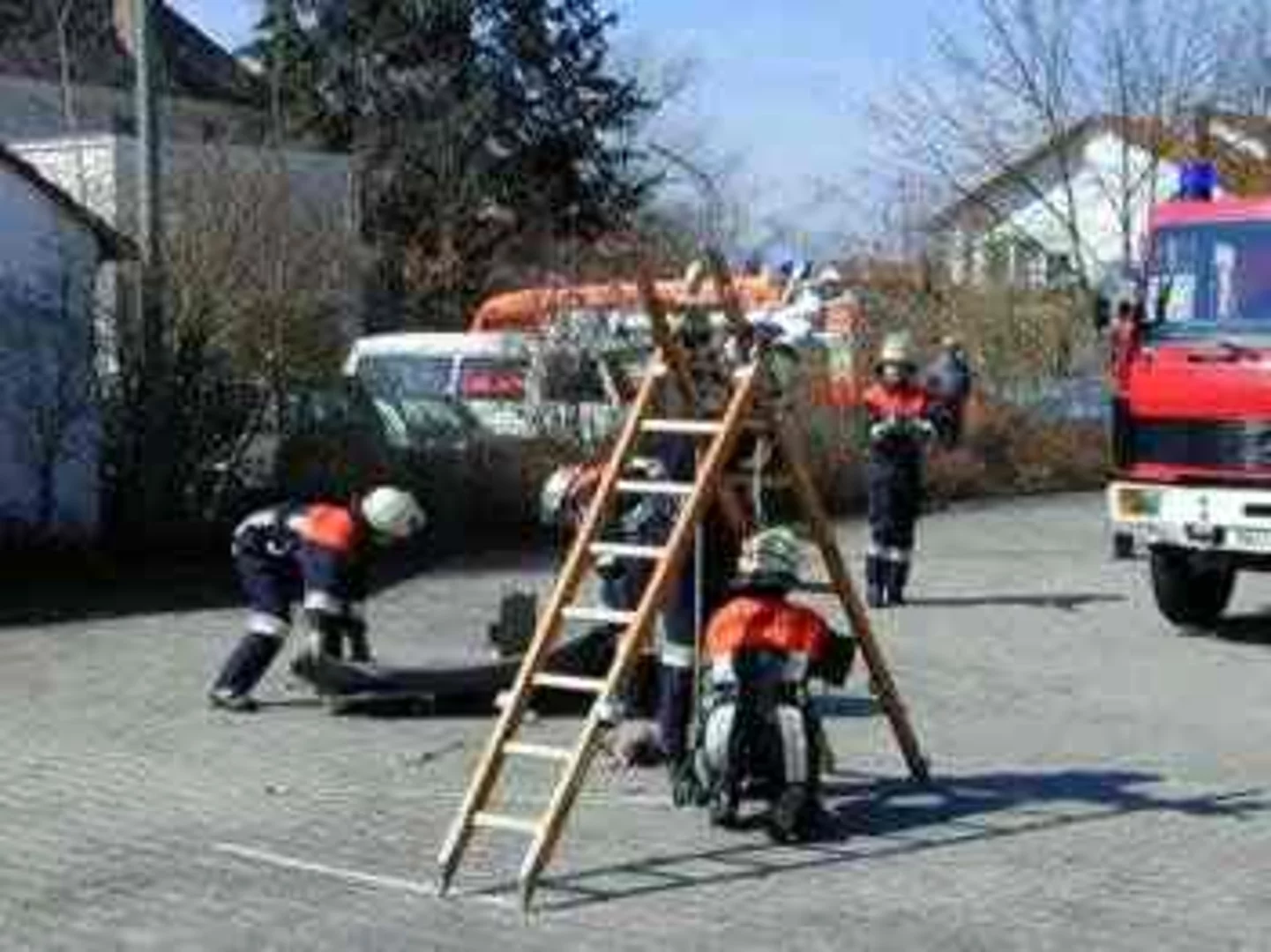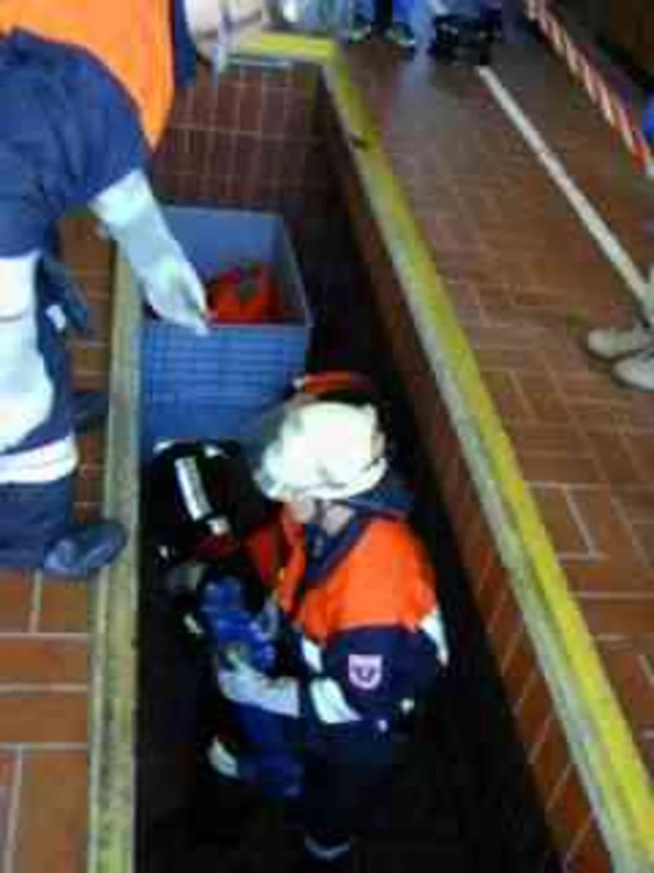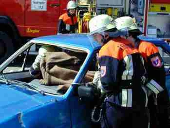 12 Jugendliche wurden vom Motto "Heiße Sache - Jugendfeuerwehr" angelockt und besuchten die Veranstaltung zur Jugendwerbung der Freiwilligen Feuerwehr. Nicht lange Vorträge standen im Mittelpunkt sondern packende Vorführungen der Dinge die den Dienst der Feuerwehr ausmachen. Zuerst wurde von den vor kurzem nach einer dreijährigen Ausbildung in den aktiven Dienst übernommenen Jungfeuerwehrleuten gezeigt wie eine bewußtlose Person fachmännisch aus einem Kanalschacht gerettet wird. Eine weiter Person mußte aus einer Fahrzeuggrube befreit werden, was erst möglich war, nachdem eine einengende Last mittels einer hydraulischen Winde entfernt wurde. Anschließend wurde ein brennender Palettenstapel gelöscht, ein Fahrradfahrer der unter einen LKW geraten war gerettet und als Höhepunkt eine im Auto eingeklemmte Person mittels Rettungsschere und -spreizer aus dem Wrack herausgeholt.