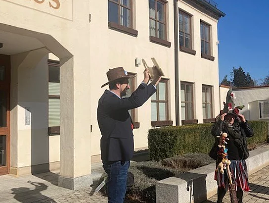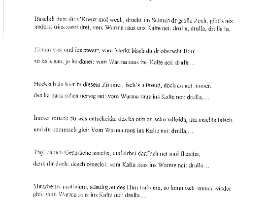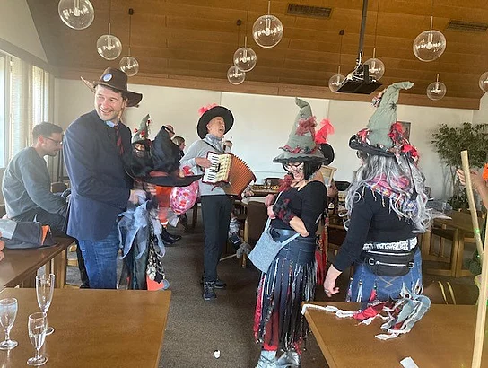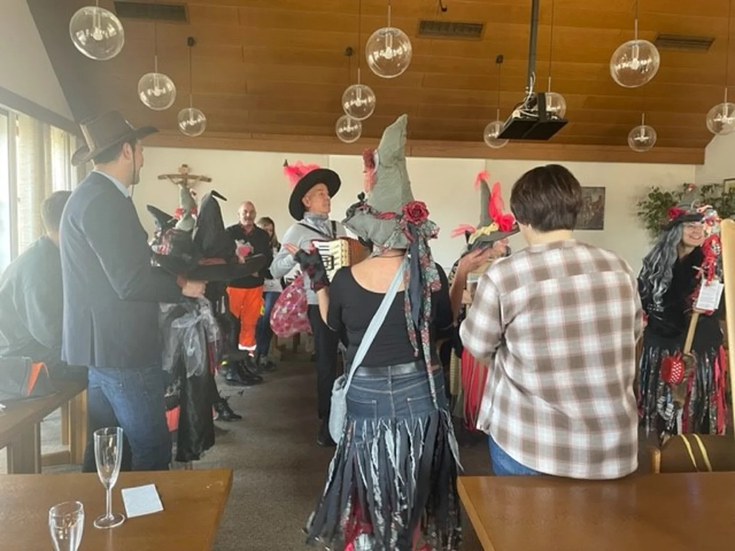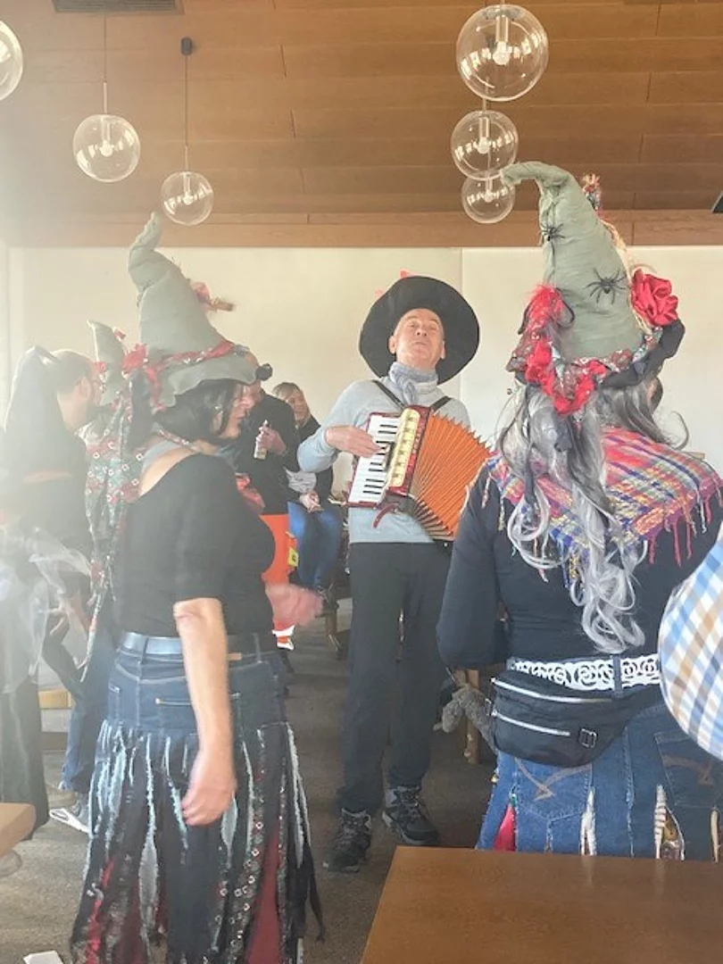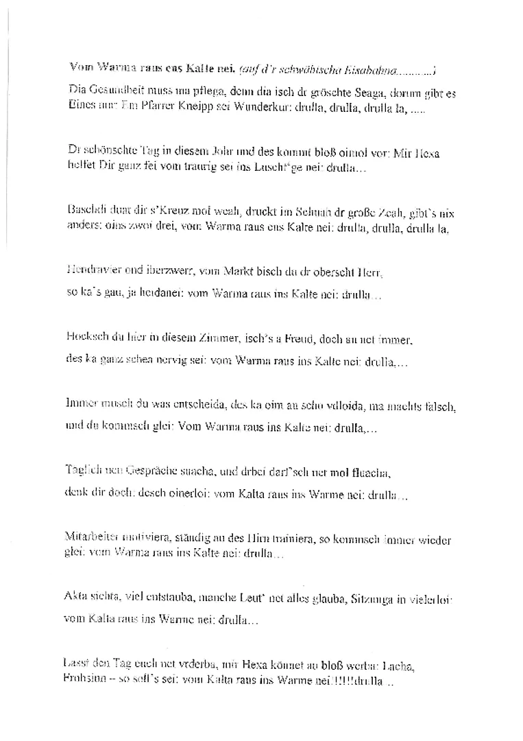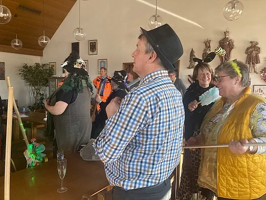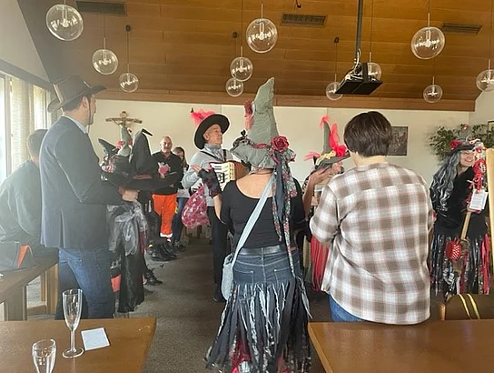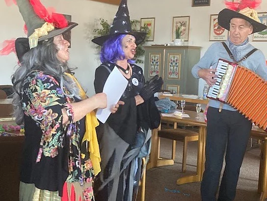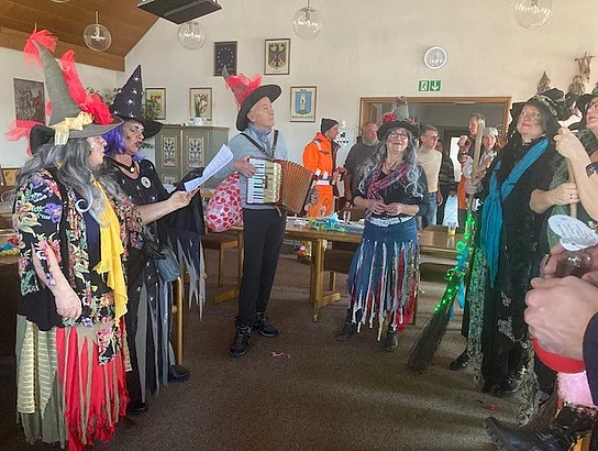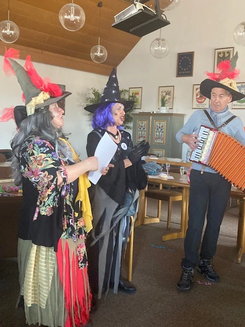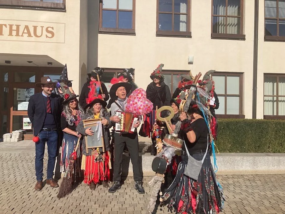 Zunächst wurden dem Schultes in traditioneller Manier die Schlüssel zum Rathaus entnommen und als Trophäe dessen Krawatte gekappt. Der Zug der wilden Hexen setzte sich fort in den Ratssaal der fortan besetzt war. Es folgten Gesangseinlagen der Hexen gemeinsame mit Werner Weltle am Akkordeon und heißkalte Gedichte auf die Melodie der schwäbischen Eisenbahn: „Lacha, Frohsinn – so solls sein: Vom Kalta raus ins Warme nei!!! Drulla, Drulla, Drulla la…“ Nur durch einen Hexentanz des Bürgermeister mit den Hexen war das Rathaus von dem Fluch zu lösen. So schee wars! Wir sagen unseren Hexen herzlich Dank!
