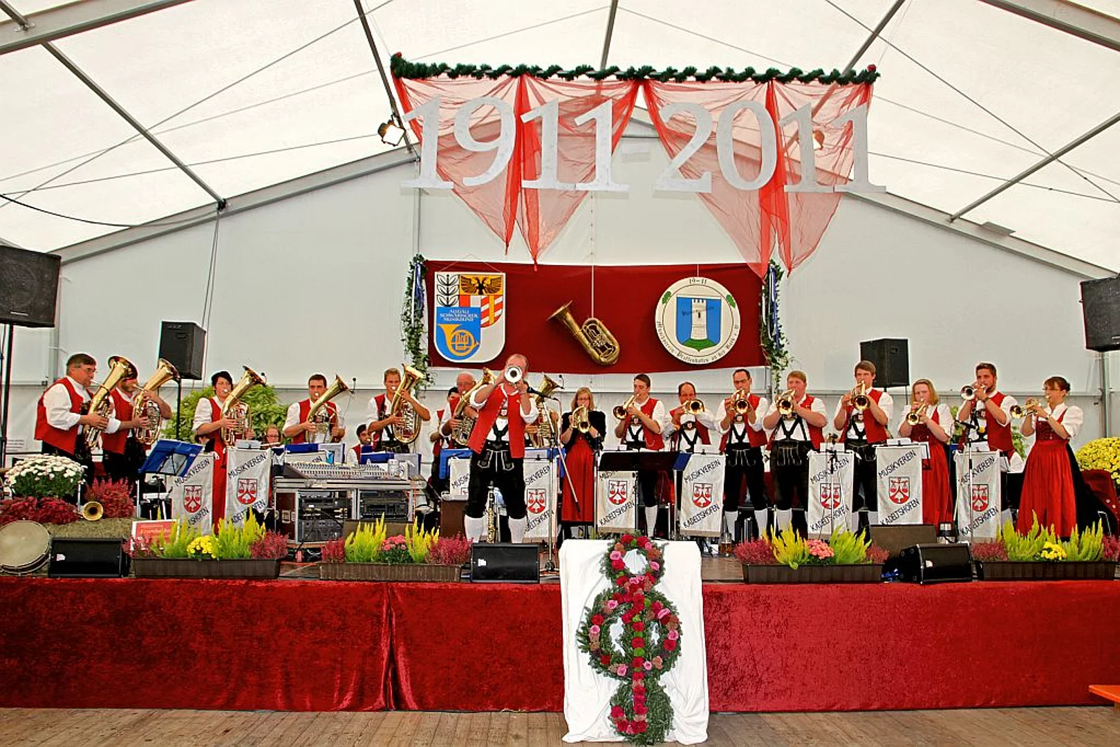 Drei Tage feiern bei bestem Spätsommerwetter, so gelang dem Musikverein Pfaffenhofen der Höhepunkt des Jubiläumsjahres. Die Feierlichkeiten begannen am Samstagabend mit Fassanstich und Stimmung im Festzelt mit der Kapelle "Blechreiz". Offiziell wurde es am Sonntag mit dem Festakt und der Verleihung der "Pro musica" Plakette. Franz-Clemens Brechtel, Ehrenvorsitzender des Allgäu-Schwäbischen Musikbundes meinte in seiner Festansprache: "Ihr lasst es ganz schön krachen – und das ist gut so“, kommentierte er die bisherigen Veranstaltungen des Jubiläumsjahres. Er würdigte weiterhin den Verein als „prächtigen Botschafter unserer Heimat und unserer Blasmusik“. Bürgermeister Josef Walz zitierte als Schirmherr den griechischen Philosophen Aristoteles mit den Worten: „Im Wesen der Musik liegt es, Freude zu bereiten“. Besonders angetan ist Walz von der Jugendarbeit des Vereins. Dank „pfiffiger Angebote“ könne der Musikverein mehrere Jugendformationen wie die Musikflöhe und die Jugendkapelle besetzen denen der Spaß und die Freude an der Musik anzumerken sei. Staatsministerin Dr. Beate Merk hob in ihren Grußworten hervor, dass die Macht der Musik schon immer stärker gewesen sei, als man sich vorstellen könne. Sie stellte fest, dass in der Musik Integration kein Thema sei, denn „es zählt nicht, aus welcher Kultur man kommt oder welche Sprache man spricht, der Funke springt über“. So sei es der Musik möglich, „auch das Verschlossene zu öffnen“. Dann überreichte sie gemeinsam mit Franz-Clemens Brechtel dem Musikvereinsvorsitzenden Mathias Reisenauer und dem Dirigenten Klaus Weiss die Pro-Musica-Plakette. Mit fünf Minuten Redezeit musste sich Mathias Reisenauer auf Bitten seiner Musiker begnügen. Er schaffte es aber doch eine kurzen Abriss der hundertjährigen Vereinsgeschichte zu geben. Der Montag stand dann ganz im Zeichen des Bezirksmusikertreffens und des großen Festumzugs der mit einem Gemeinschaftschor aller teilnehmenden Musikkapellen im vollbesetzten Festzelt endete.