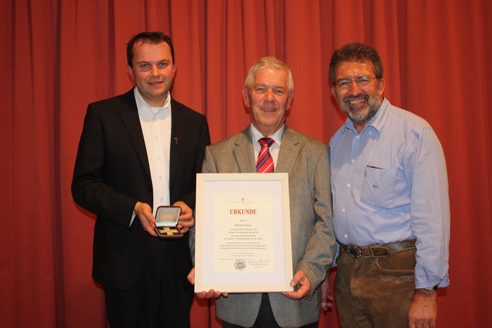 Anlässlich seines 70. Geburtstags wurde Herrn Matthias Braun durch den Generalvikar der Diözese Augsburg, Karlheinz Knebel, das Ulrichskreuz in Gold mit Ehrenurkunde verliehen. Es handelt sich um die höchste Auszeichnung für ehrenamtliche Mitarbeit in der Diözese Augsburg. Herr Braun hat über Jahrzehnte als Kirchenverwaltungs- und Pfarrgemeinderatsmitglied, Kindergartenverwalter und Kirchenpfleger das Bild der Pfarrgemeinde St. Martin in Pfaffenhofen entscheidend mitgeprägt. Der Generalvikar schreibt daher in einem Brief an Pfarrer Reinfried Rimmel: „Für seine herausragenden Verdienste und sein überaus erfolgreiches ehrenamtliches Engagement für die Kirchstiftung St. Martin spreche ich Herrn Braun meine Anerkennung und Wertschätzung aus. Sein Vorbildlicher Einsatz - wie der vieler Katholiken - ist die Grundlage, auf der unsere Pfarreien in eine gute Zukunft wirken können.“ Pfarrer Rimmel überreichte im Namen des Generalvikars zusammen mit den Kirchenverwaltungsmitgliedern und dem Pfarrgemeinderatsvorsitzenden im Martinushaus das Ulrichskreuz sowie die Ehrenurkunde des Bistums Augsburg. Bei der Aushändigung an der Geburtstagsfeier war auch Bürgermeister Josef Walz zugegen und gratulierte im Namen des Marktes Pfaffenhofen zu dieser besonderen Auszeichnung und Würdigung seines ehrenamtlichen Wirkens.