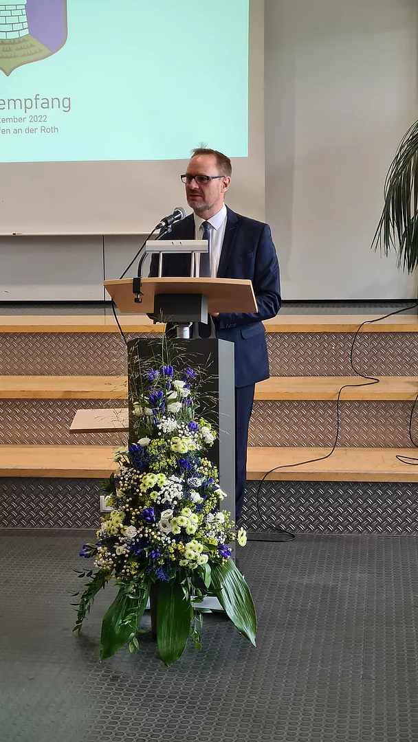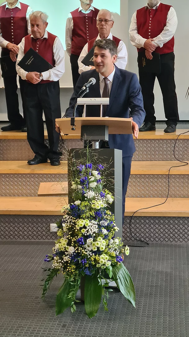 Eröffnet wurde der Empfang durch einen musikalischen Beitrag des Männerchors des Liederkranzes, der gemeinsam mit dem gemischten Chor den Festakt musikalisch umrahmte. Anschließend begrüßte Bürgermeister Dr. Sebastian Sparwasser die Gäste und Ehrengäste, unter ihnen der Bundestagsabgeordnete Alexander Engelhardt und die Landtagsabgeordnete Dr. Beate Merk sowie zahlreiche aktive und ehemalige Bürgermeisterinnen und Bürgermeister aus dem Landkreis, Marktgemeinderäte, Kreisräte und Vertreter des Bayerischen Gemeindetags.