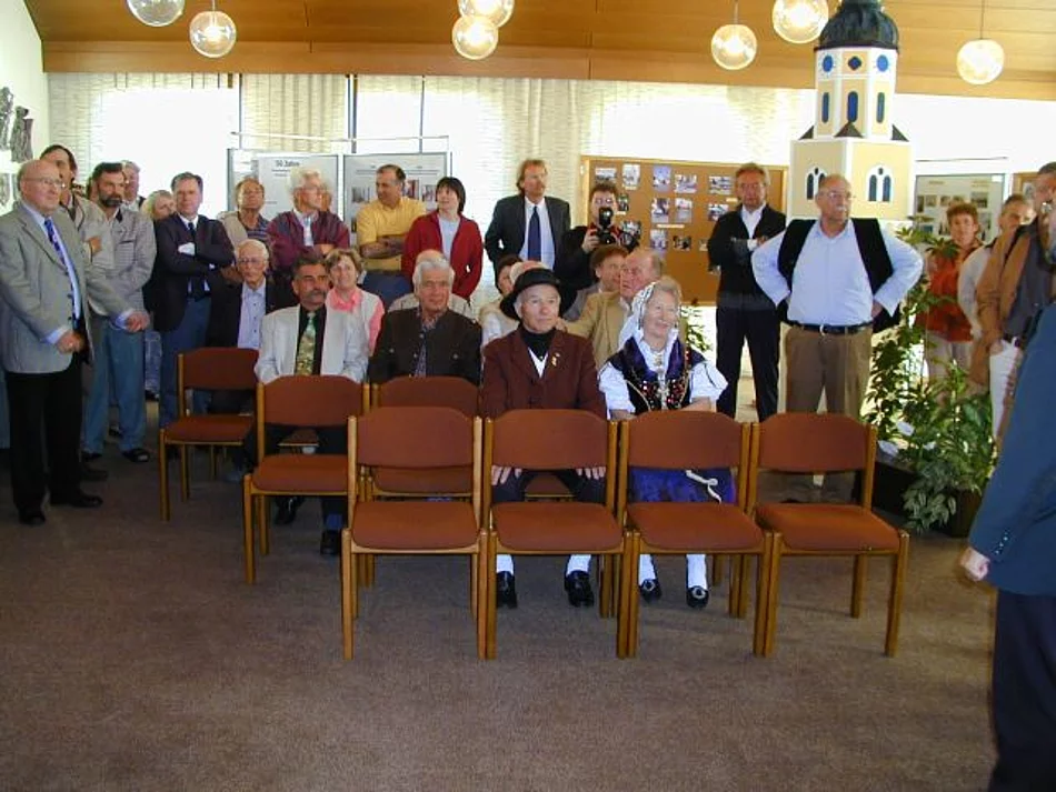 Dann ging es vom Freien in den Sitzungssaal des Rathauses, der auch einen Großteil der Ausstellung beherbergte. Absoluter Blickfang war der Pfaffenhofener Kirchturm aus Pappmache, der von Eltern der diesjährigen Kommunionkinder gebastelt worden war. Dahinter hat die Kirchengemeinde Bilder und Gegenstände aus ihrer Geschichte aufgestellt. Der Fotoclub gab mit einer Auswahl aus alten und neuen Fotos einen Überblick über das vergangene und gegenwärtige Leben im Ort. Eine Ecke war für die Sudetendeutsche Landsmannschaft reserviert, die Trachten und Gegenstände aus der alten Heimat zeigte. Fast ein komplettes altes Klassenzimmer mit Schulbänken, Tafel und Landkarte hatte die Hermann-Köhl-Schule aufgestellt. Weiter Exponate wie ein hölzerner Schulranzen, ein altes Klassenbuch oder ein Buchstabensetzkasten zum Lesenlernen illustrierten anschaulich die Geschichte im schulischen Bereich. In die etwas jüngere politische Vergangenheit führten Schautafeln zur Gebietsreform, die sich heuer zum 25 Mal jährt. Im Erdgeschoß wurde die ständige Hermann-Köhl-Ausstellung um zusätzliche Ausstellungsstücke erweitert. Im Kellergeschoß zeigten dann die Schnitzerfreunde ihr können. Kunstvolle Arbeiten, von Krippenfiguren über Schatullen bis hin zu modernen Reliefarbeiten reichte das Spektrum . Ganz oben im Dachgeschoß war die historische Sammlung , die von Chronist Herbert Schörnig betreut wird, geöffnet. Viele Gerätschaften und Kleidungsstücke aus dem vergangenen täglichen Leben waren dort zu sehen.