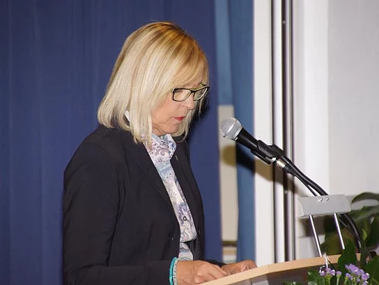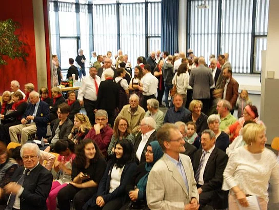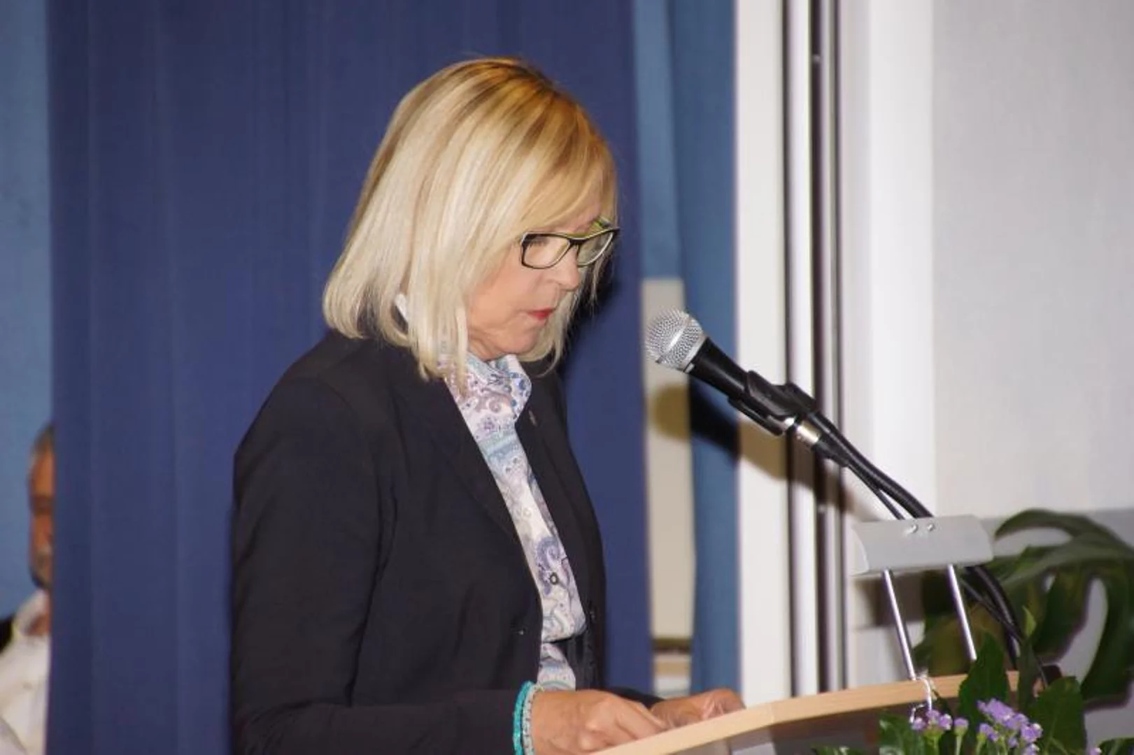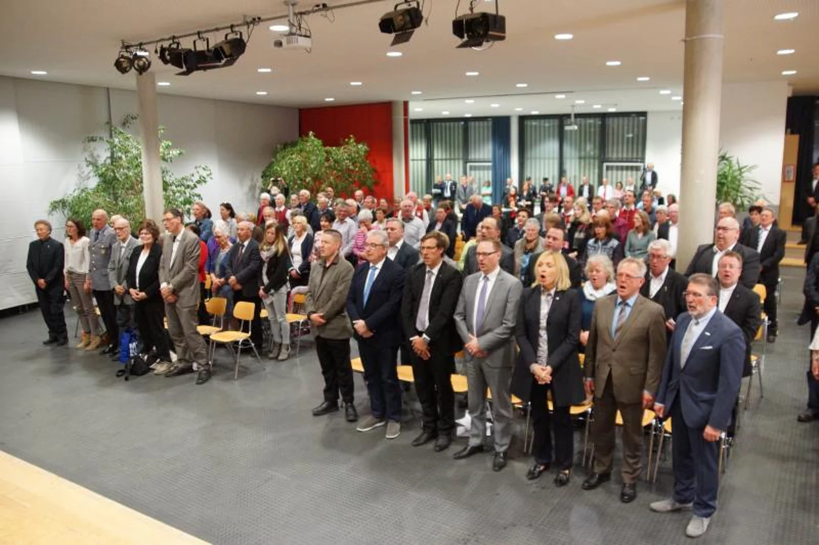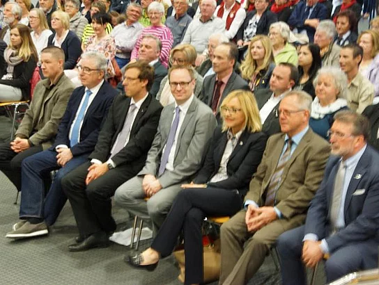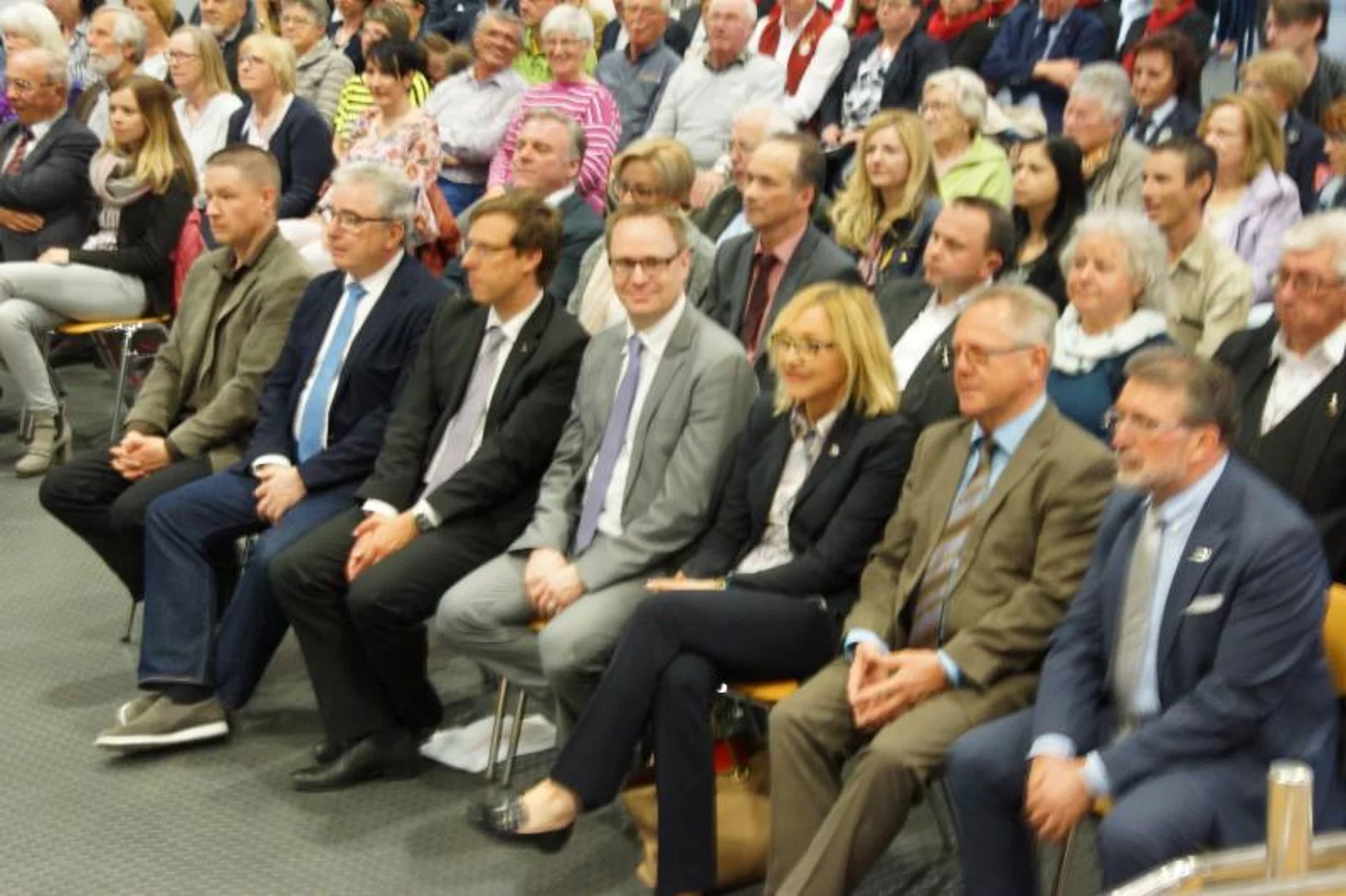 Nach dem Gottesdienst wurden die Feierlichkeiten in der gut gefüllten Aula der Hermann-Köhl-Schule fortgesetzt. Als Gäste konnten unter anderen der Oberbürgermeister der Stadt Neu-Ulm, Gerold Noerenberg, Vertreter der Hermann-Köhl-Kaserne in Niederstetten und die Staatsministerin a. D. Dr. Beate Merk begrüßt werden. Diese hielt auch die Festansprache in der sie den Mut des Flugpioniers lobte.