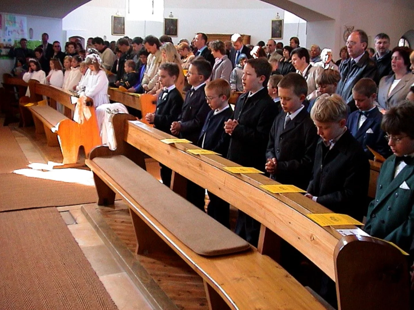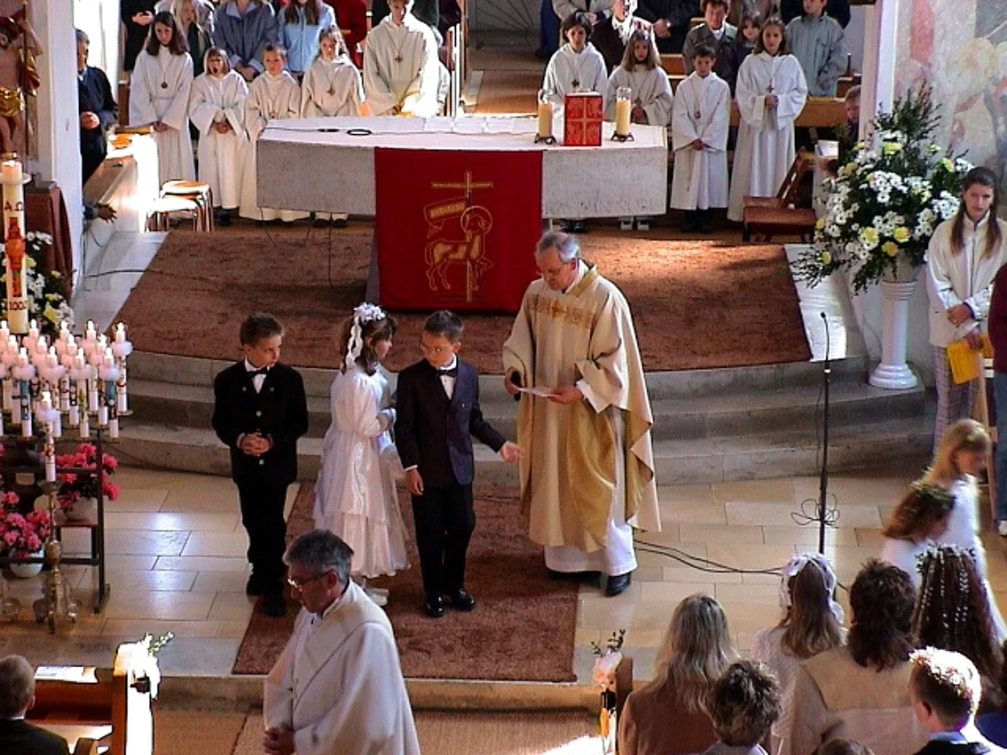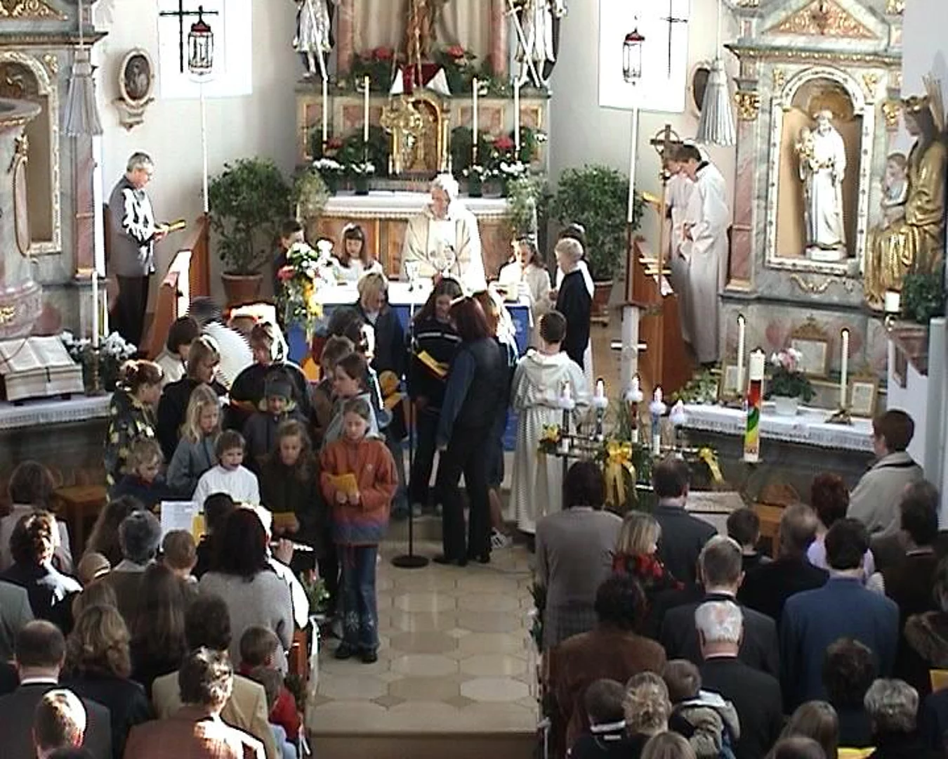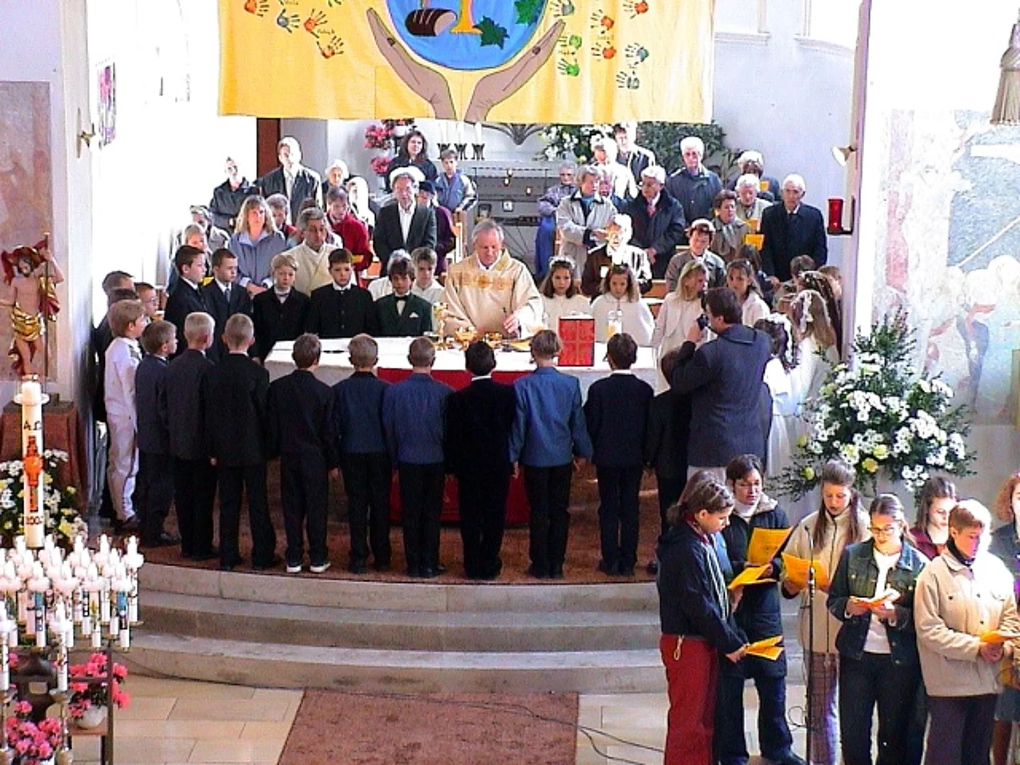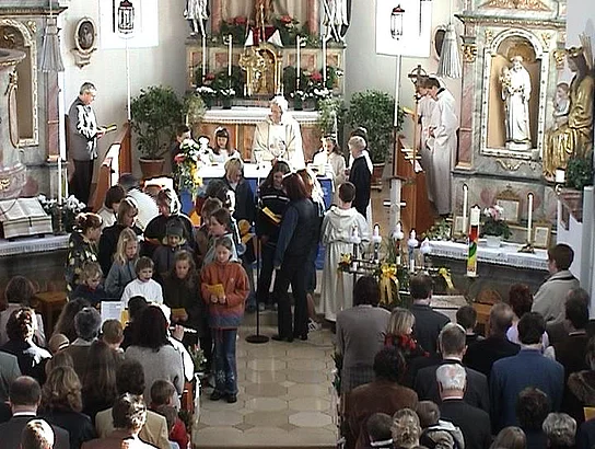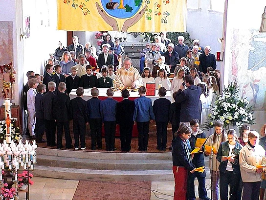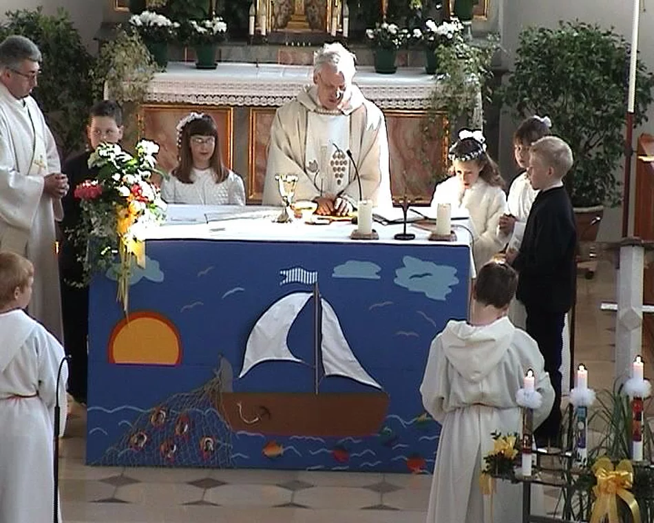 Fünf Kinder in Beuren und neunundzwanzig in Pfaffenhofen konnten das Fest ihrer Erstkommunion feiern. Bei zwar niedrigen Temperaturen aber strahlendem Sonnenschein wurden sie von den örtlichen Musikvereinen und ihren Angehörigen zur Kirche begleitet. In Beuren hatten die Mütter der Kommunionkinder ein Altarbild gestaltet, das ein Boot mit einem Fischer zeigte. In seiner Predigt ging Pfarrer Egger darauf ein indem er die Kirche mit einem Netz verglich. "Ein Netz, " sagte er, "hält nicht nur gefangen, so wie manche die Kirche vielleicht empfänden, ein Netz gebe auch Geborgenheit und Sicherheit, wie das Netz das den Seiltänzer im Zirkus schützt." Die Erstkommunion in Pfaffenhofen stand unter dem Motto "Hände". Auf dem Altarbild waren die Abdrücke der kleinen Hände der Kommunionkinder zu sehen und zwei große Hände die die Weltkugel hielten. Hier zeigte Pfarrer Egger die Freiheit des menschlichen Handelns auf, indem er deutlich machte, dass Hände sowohl Gutes tun als auch Schreckliches anrichten können.
