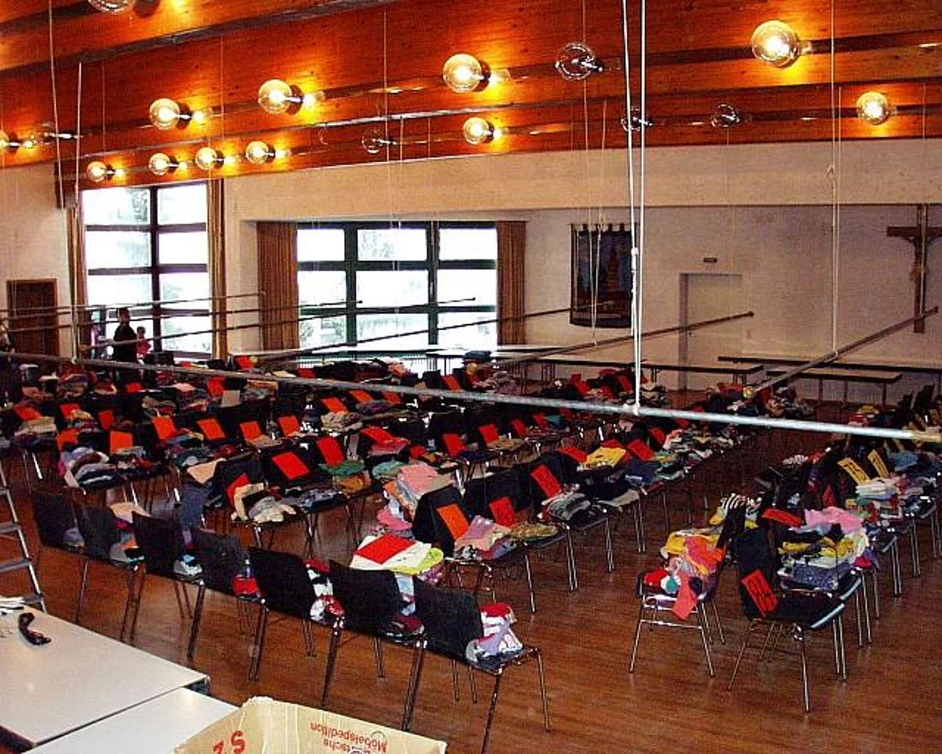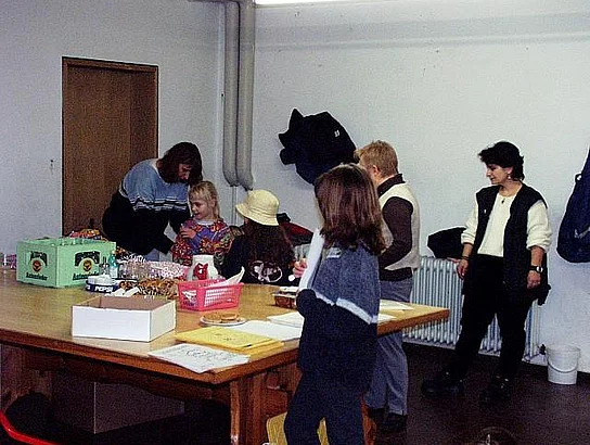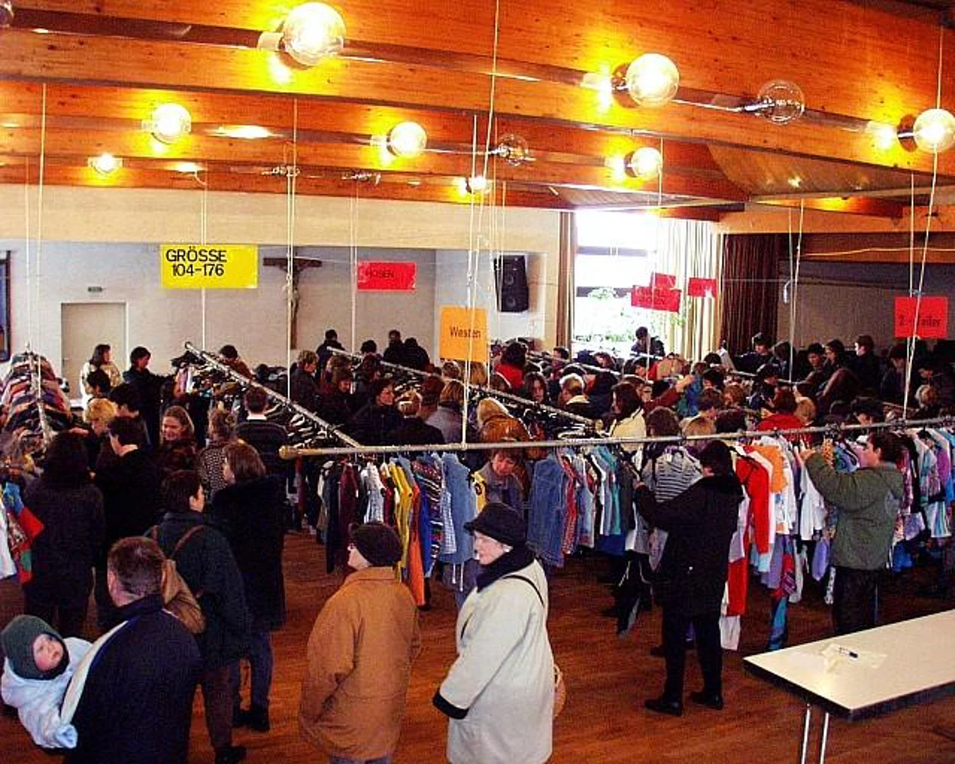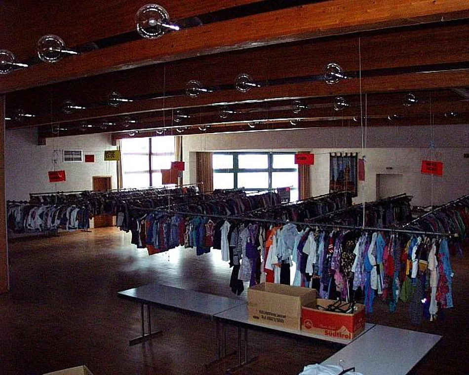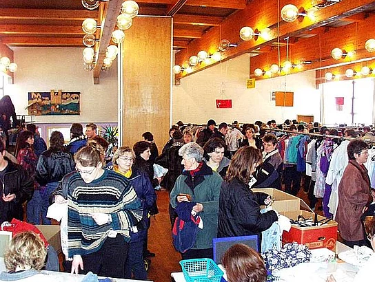 Am Samstag, den 3. März 2001 fand der traditionelle Kleidermarkt Frühjahr 2001 statt. Die von den Anlieferern abgegebenen Kleidungsstücke wurden kontrolliert und auf Bügel appliziert, nach Größen, Art (Baby oder Kinder und Jugend) sortiert und auf Stahlrohren oder Holzgestellen aufgehängt. Die einzelnen Bereiche (Hosen, Jacken und Mäntel, T-Shirts, Blusen, Babyartikel) wurden gekennzeichnet. Ca. 5000 Kleidungsstücke standen zum Verkauf zur Verfügung. Am Samstag um 14.00 Uhr war der Ansturm sehr groß, so daß innerhalb von 2 Stunden gut 50% der angelieferten Kleidungsstücke einen Käufer fanden.