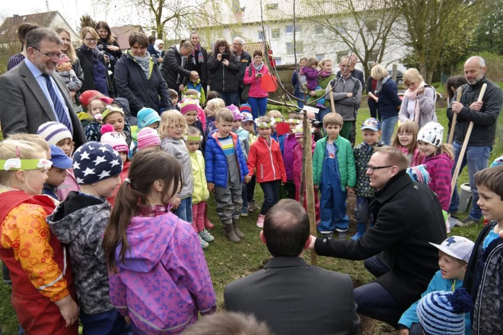 Da waren die Kinder des AWO-Kindergartens "Sonnenschein" im Pfaffenhofener Ortsteil Berg begeistert. Landrat Torsten Freudenberger besuchte sie und hatte auch etwas mitgebracht. Einen Apfelbaum der seltenen heimischen Sorte "Pfaffenhofener Schmelzling". Dieser sollte anlässlich des Tag des Baumes an ihrem Kindergarten gepflanzt werden. Bevor es aber ans gärtnerische Werk ging unterhielten die Kinder unter der Leitung von Jutta Heim die Gäste mit Gesang, Baumschmuck, Tanz und Gedicht. Nach erfolgreicher Pflanzung wurde der Setzling gleich mit einer formvollendeten La-Ola-Welle gefeiert.