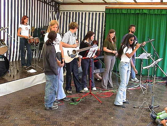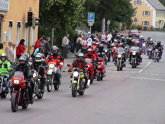 Bis zum Sonntagmorgen war es dann auch nicht wärmer geworden aber immerhin trocken geblieben. So fanden sich immerhin rund 300 Motorradfahrer zum Motorradcorso ein. Der anschließende Motorradgottesdienst wurde musikalisch von der Kolpingband Regenbogen aus Pfuhl gestaltet. Den Bezug zum Motorradfahren stellte Diakon Edwin Rolf in seiner Predigt her, indem er den Glauben mit den Einzelteilen eines Motorradhelms verglich. Das Visier gebe den Augen Schutz und klare Sicht, damit man Gefahren rechtzeitig erkenne und das Ziel nicht aus den Augen verliere. Wie ein guter Glaube gebe der Kinnriemen Sicherheit, enge aber nicht ein. So wie das Innenpolster Sicherheit gäbe, so seien auch manche harte Schläge nur durch den Halt im Glauben zu ertragen. Wie der Glaube, so gäbe auch die harte Außenschale Schutz und halte alles zusammen. Zur Vor- und Rücksicht mahnte Diakon Rolf mit den Worten: "Als Biker haben wir Pflichten, die unser Leben und das Leben der Anderen auf der Straße schützen sollen. Nach dem Gottesdienst ging es dann auf dem Festplatz richtig los. Die Country und Western-Band "smoke stack ligntnin´" aus Schwabach, die für die kurzfristig ausgefallenen "Cadillac Cowboys" eingesprungen war, legte zum Frühschoppen so richtig los und bot fetzige Musik vom Feinsten. Es war ihnen nicht anzumerken, dass sie quasi direkt aus dem Tonstudio von Aufnahmen für ihre neue CD losgefahren waren um rechtzeitig auf dem Marktfest auftreten zu können. Bis zum Mittag war das marktfest bis auf den letzten Platz gefüllt und as Publikum wartete gespannt auf die neue besondere Attraktion, den "Marktplatz der Talente". Das "Brett im Schtoi" hatte mit der Festgemeinschaft unbekannten und etwas bekannteren Pfaffenhofener Künstlern die Gelegenheit gegeben, sich einem größeren Publikum zu präsentieren. Volksmusikalisches präsentierte die Gruppe "Sparpaket" und heizte die Neugier auf das Folgende an. Moderiert wurde das ganz vom bekannten Pfaffenhofener Dichtertalent Klaus Maucher. Tierisch wurde es dann beim Manöver, wie es die Jugendgruppe St. Martin darstellte. Ruhige schöne, zum Teil selbst geschriebene Balladen sang Birgitt Neffe zur Gitarre. Dann mußte vor der Bühne Platz geschaffen werden, da die große Anzahl der Akteure auf ihr nicht den benötigten Platz gefunden hätte und die Musik wurde richtig rockig. Die Rockodiles vom Nikolaus-Kopernikus-Gymnasium, unter ihnen auch viele Pfaffenhofener Schüler, gaben akrobatischen Rock´n Roll Tanz zum Besten. Den Schwenk hin zum Klassischen schaffte der Auftritt der Jugendgruppe St. Martin. Mit lustigen Froschhandpuppen wurde ein Froschkonzert mit einer Arie aus Carmen veranstaltet. Eine kurze Umbaupause wurde erforderlich um den Auftritt der Schulband der Hermann-Köhl-Schule vorzubereiten. das Warten hatte aber gelohnt, mit heißen Rhythmen begeisterte sie das Publikum. Etwas ruhiger wurde es dann wieder bei der "Ballade vom Gesangsverein", der ja überall dabei sein müsse, egal ob Hochzeit, Taufe oder Beerdigung. Auch mit den restliche Strophen des Liedes nahm die Gesangsgruppe des Liederkranzes Pfaffenhofen das Gesangsvereinsleben und damit sich selbst auf die Schippe. Passend zum inzwischen wirklich schönen und warmen Wetter gaben die Damen Strobel und Störk einen Sketch von zwei Weibern, die sich am italienischen Strand über ihre Miturlauber auslassen, zum Besten. Den krönenden Abschluss bildete dann der Zirkus X. Mit gekonnten Jongladen, Feuerschlucken und Fakirkünsten brachten die jungen Künstler das Publikum zum Staunen. Die Mischung macht´s, so kann man wohl den Erfolg dieses Marktfestnachmittags am besten charakterisieren. Da dieser "Marktplatz der Talente" so gut ankam, ist mit einer Fortsetzung beim nächsten Marktfest zu rechnen. Inzwischen schon fast traditionell, spielte zum Festausklang die Musikkapelle Pfaffenhofen. Die meisten Essenstände meldeten schon lange vor Festende, dass sie ausverkauft seien, was bei dem hohen Besucherandrang auch nicht verwunderlich war. So gab es bei der Festgemeinschaft nur zufriedene Mienen.