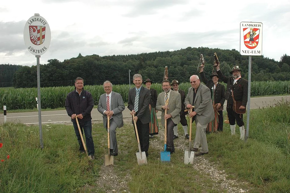 Früh am Morgen trafen sich an der Grenze der beiden Landkreise Günzburg und Neu-Ulm der Günzburger Landrat Hubert Hafner, der stellvertretenden Neu-Ulmer Landrat Roland Bürzle, der Bürgermeister der Gemeinde Bibertal Robert Strobel und der Bürgermeister von Pfaffenhofen Josef Walz. Anlass war der Spatenstich zur Erneuerung der Kreisstraße zwischen Balmertshofen und Hetschwang. Die Straße wird verbreitert, bekommt ein Regenablauf und was besonders wichtig ist, einen Fuß- und Radweg. Dadurch wird die Sicherheit für alle Verkehrsteilnehmer wesentlich verbessert. Diese guten Aussichten wurden von den Böllerschützen des Hetschwanger Schützenvereins "Bundschuh" mit einem lauten Salut gewürdigt. Das Teilstück von Hetschwang bis zur Landkreisgrenze kostet den Landkreis Günzburg 270.000 €, zum Rad- und Gehweg steuert die Gemeinde Bibertal 22.000 € bei. Zum Bauabschnitt I auf Neu-Ulmer Seite gehört der Ausbau der Kreisstraße und der Bau des Geh- und Radwegs von Balmertshofen bis zur Landkreisgrenze. Später werden die Kreisstraße und der Geh- und Radweg weiter ausgebaut von Balmertshofen bis Biberberg im Bauabschnitt II. Mit dem neuen Geh- und Radweg wird das Radwegenetz in den landschaftlich reizvollen Tälern von Osterbach und Biber erweitert. In den Ortseinfahrten werden die Bereiche der Einmündungen des Radwegs verbreitert. Für beide Abschnitte sind auf Neu-Ulmer Seite Kosten von etwa 1,18 Millionen Euro angesetzt. Staatliche Zuwendungen werden in Höhe von etwa 440000 Euro erwartet. Der Markt Pfaffenhofen beteiligt sich laut Planung voraussichtlich mit 90000 Euro, auf den Kreis Neu-Ulm entfallen 654000 Euro.
