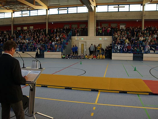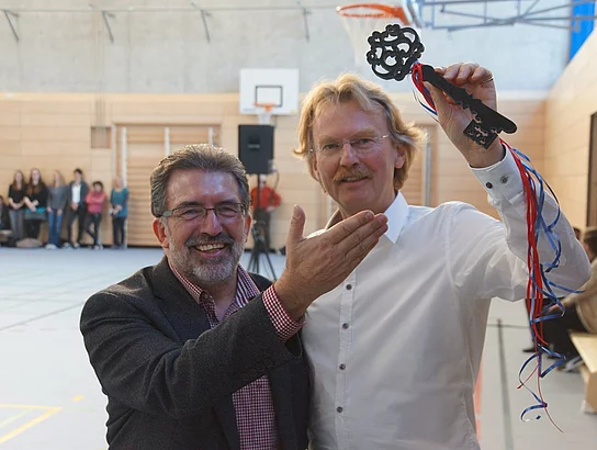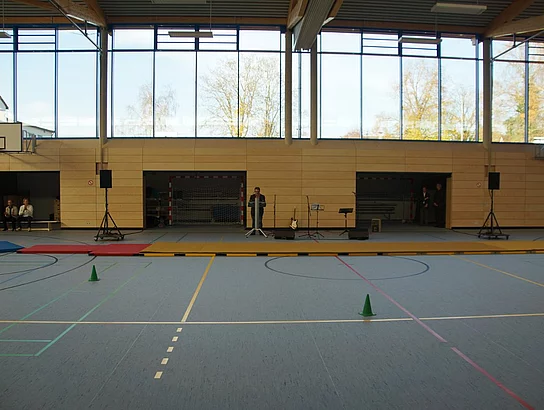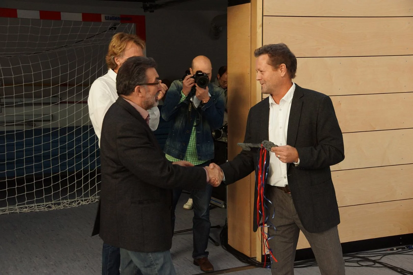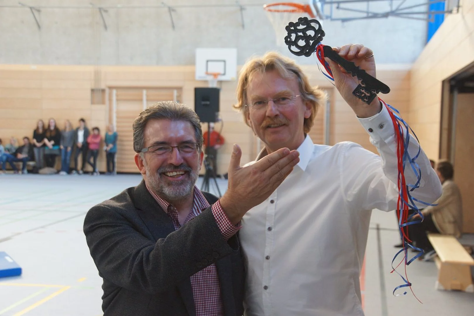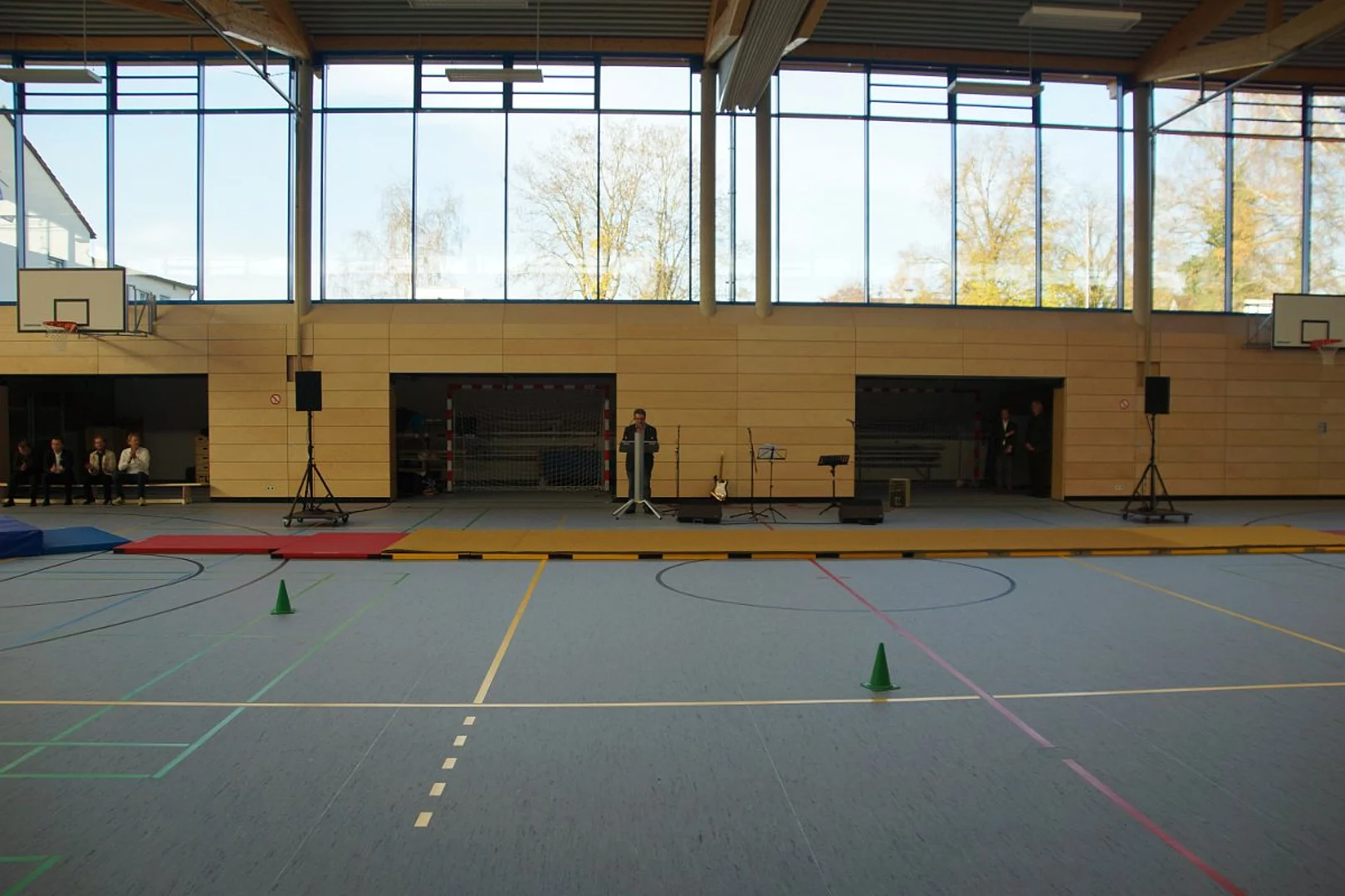 Eindringlich schilderte der Architekt die Lage der alten Halle. Dieser hatten nach einer ausgiebigen Party im März 2013 Bagger ein Ende gemacht. Als habe der Bau nach Jahrzehnten darum gebeten, abgerissen zu werden: „Mein Werk ist vollbracht, lasst mich sterben“, fasste Spiegler den Zustand des alten Bauwerks zusammen. Eine Sanierung habe sich als unwirtschaftlich herausgestellt, weshalb Abbruch und Neubau beschlossen wurden. Schulleiter Rolf Gassner, der neben Bürgermeister Walz neuer Hausherr der Halle ist, zeigte sich erleichtert, da mit der Einweihung nun eine schwierige Zeit ein gutes Ende finde. Denn ein Jahr ohne Turnhalle sei kein gutes Jahr. Gassner dankte der Gemeinde Holzheim und ihrer Bürgermeisterin Ursula Brauchle, die während der Bauzeit die Türe ihrer Sportstätte für die Schüler aus Pfaffenhofen geöffnet hatte: „Ohne Euch wäre ein Sportunterricht nicht möglich gewesen,“ sagte Gassner.
