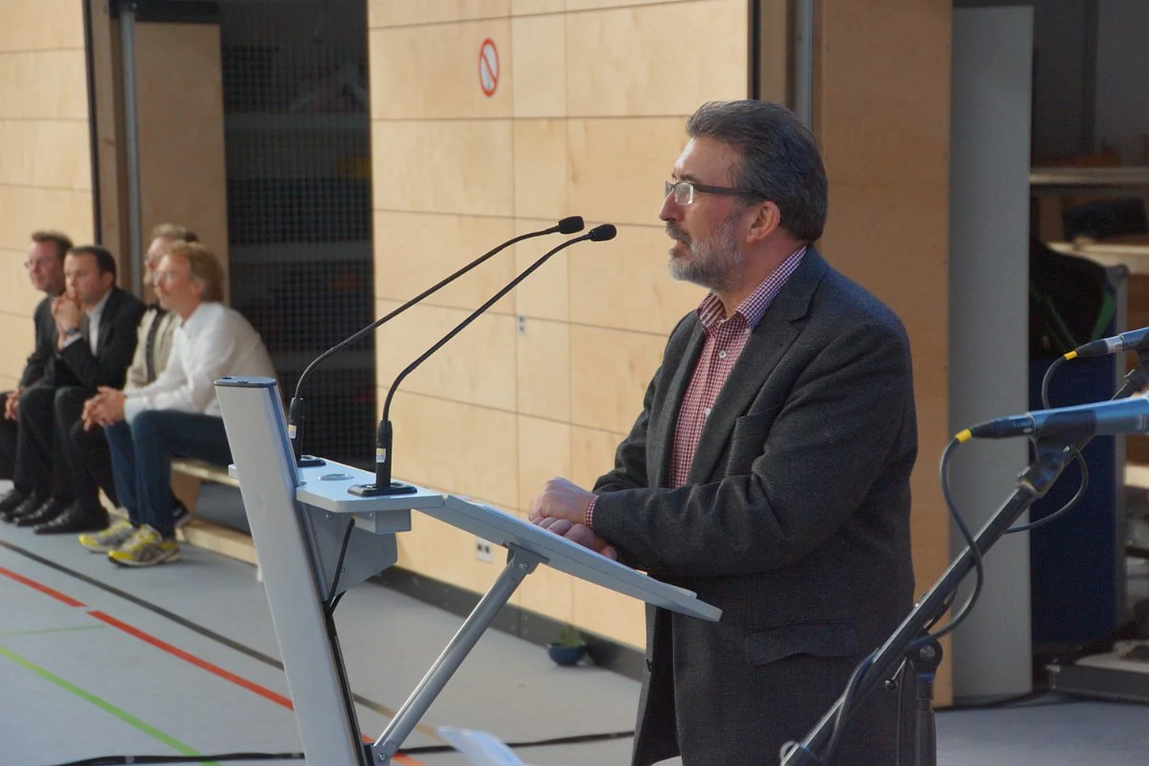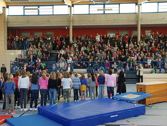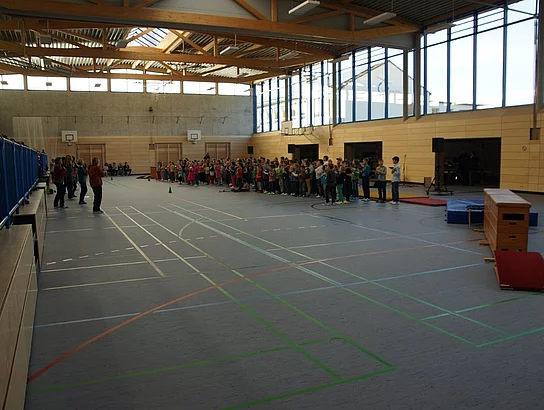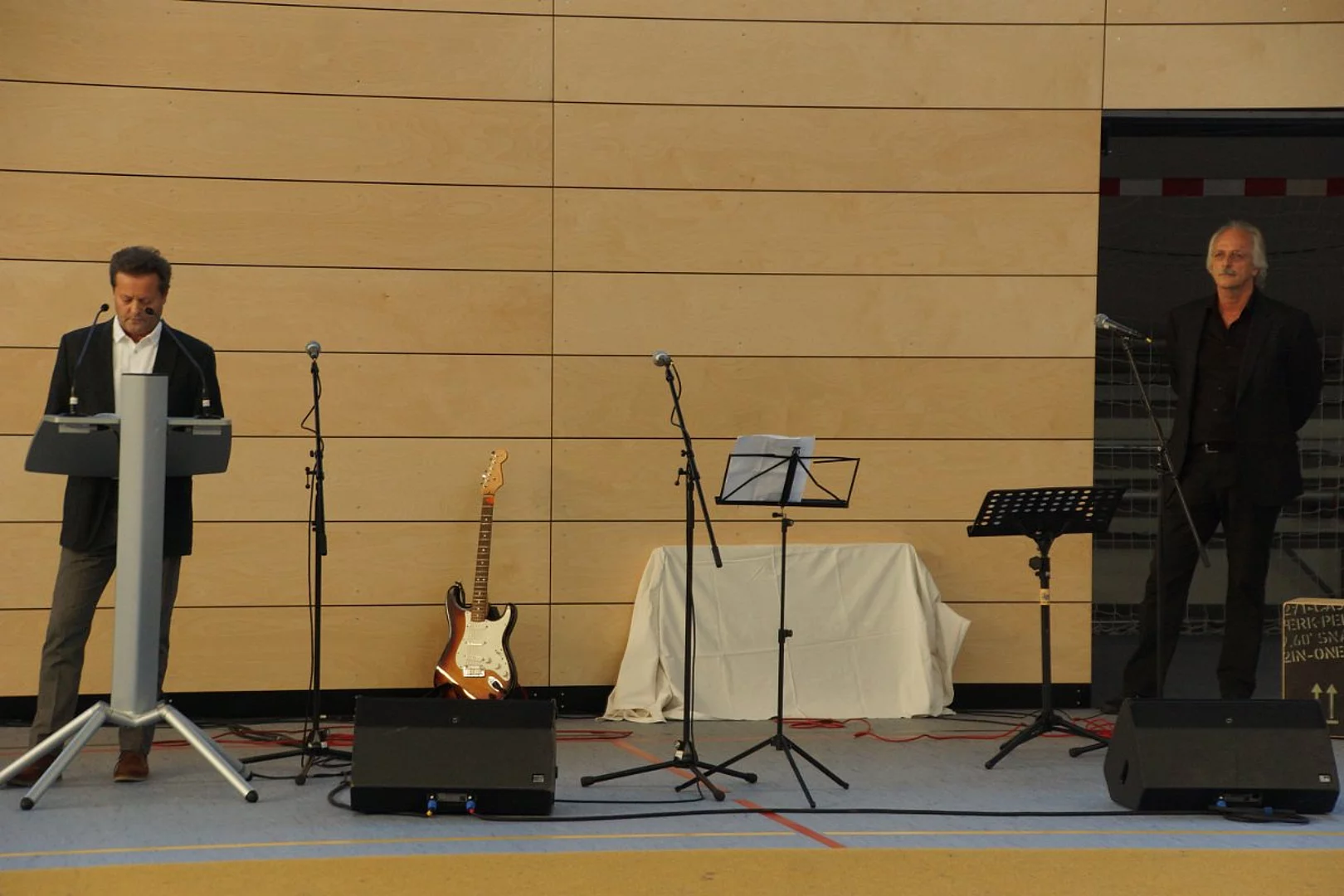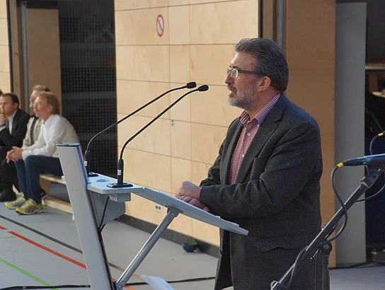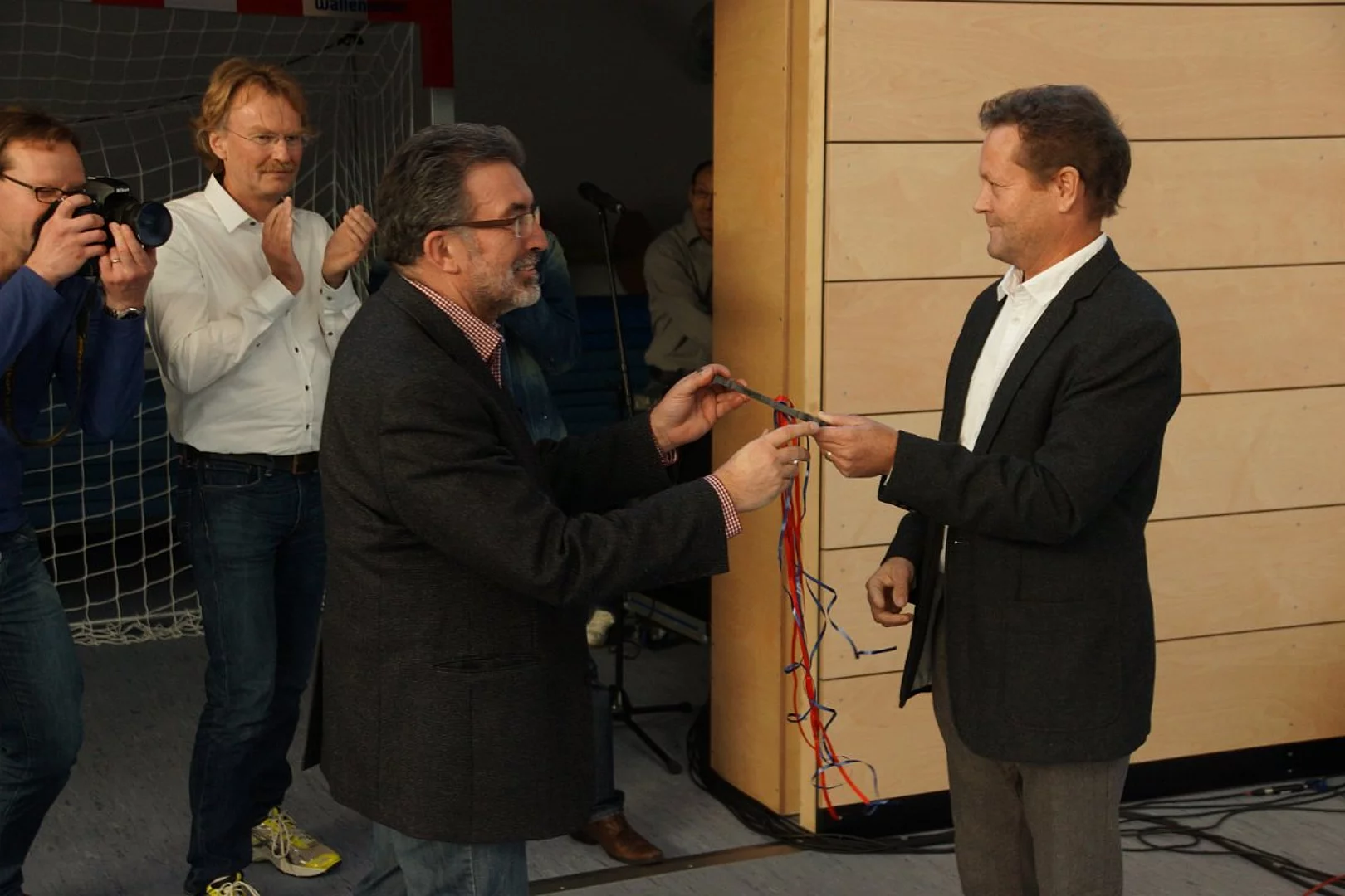 Eindringlich schilderte der Architekt die Lage der alten Halle. Dieser hatten nach einer ausgiebigen Party im März 2013 Bagger ein Ende gemacht. Als habe der Bau nach Jahrzehnten darum gebeten, abgerissen zu werden: „Mein Werk ist vollbracht, lasst mich sterben“, fasste Spiegler den Zustand des alten Bauwerks zusammen. Eine Sanierung habe sich als unwirtschaftlich herausgestellt, weshalb Abbruch und Neubau beschlossen wurden. Schulleiter Rolf Gassner, der neben Bürgermeister Walz neuer Hausherr der Halle ist, zeigte sich erleichtert, da mit der Einweihung nun eine schwierige Zeit ein gutes Ende finde. Denn ein Jahr ohne Turnhalle sei kein gutes Jahr. Gassner dankte der Gemeinde Holzheim und ihrer Bürgermeisterin Ursula Brauchle, die während der Bauzeit die Türe ihrer Sportstätte für die Schüler aus Pfaffenhofen geöffnet hatte: „Ohne Euch wäre ein Sportunterricht nicht möglich gewesen,“ sagte Gassner.