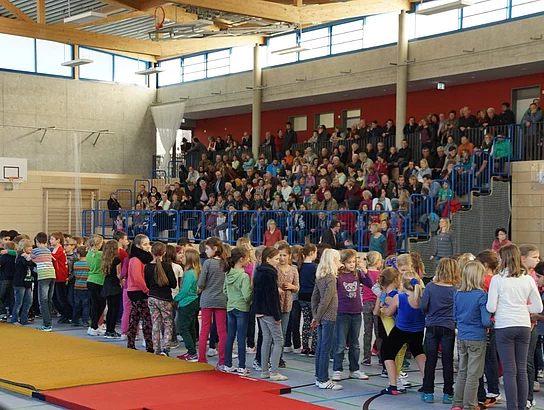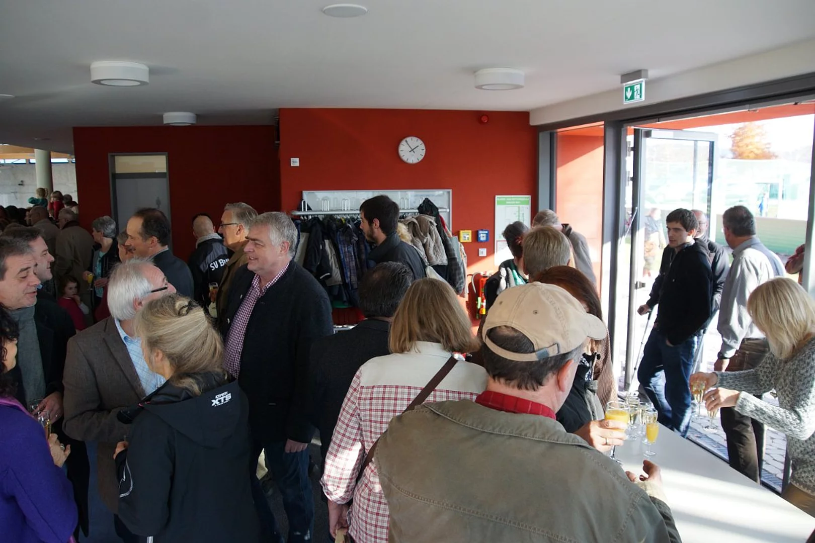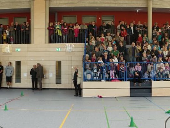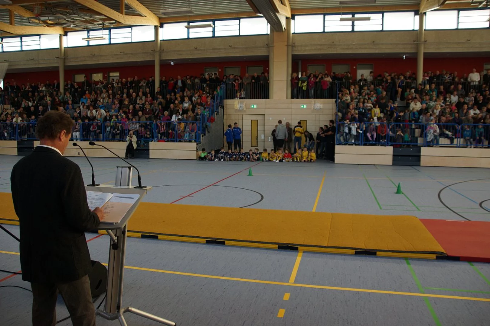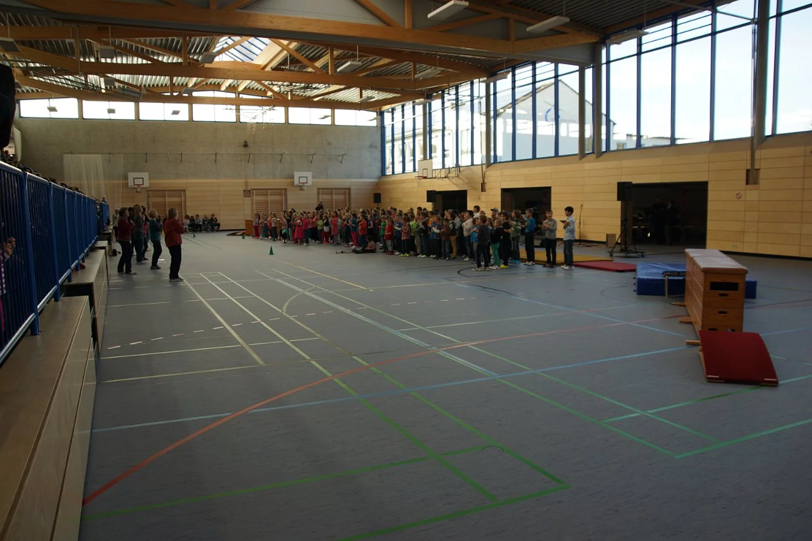 Großes Interesse fand die Feier zur offiziellen Eröffnung der neuen Zweifachsporthalle. Rund 600 Besucher strömten zum Neubau um die Einweihung mitzuerleben. Am Eingang wurden sie vom Dritten Bürgermeister Karlheinz Thoma mit einem Glas Sekt begrüßt, in der Halle wartete dann ein großes Programm auf sie. Die Turngruppe des SV Pfaffenhofen begeisterte mit einem rasanten Turnprogramm, die Bambini-Fußballer des SV Beuren und des SV Pfaffenhofen zeigten, dass die neue Halle für Fußball bestens geeignet ist. Von den Bürgern wurde besonders die Teleskoptribüne begrüßt, die jetzt jedem Besucher einen freien Blick auf das Geschehen gestattet. Für musikalische Unterhaltung sorgte die Allstar-Band und rockte die Halle. Bürgermeister Josef Walz nannte den Neubau ein „neues Fundament für das sportliche Leben in der Marktgemeinde“. Bei einer Länge von 44 Metern und einer Breite von 22 Metern sei jetzt genug Platz für jede Art von Ballsportarten. Dabei sei jeder Cent für die Sportförderung gut angelegt, betonte Walz. Rund vier Millionen Euro kostete die Markgemeinde der Neubau. Mit Blick auf die anwachsende Zahl von „Zivilisationserkrankungen“ wie etwa Fettleibigkeit oder motorische Probleme müsse das Motto lauten – „Sport hält fit“. Deshalb sei es die Aufgabe der Kommunen und Schulen, ein Angebot für kleine und große Sportler zu schaffen. Bei allen Trendsportarten sei die Grundlage der Leichtathletik unverzichtbar, sagte Walz. So könnte die Halle zu Höchstleistungen beflügeln – und schließlich bräuchte jedes Sportass auch einen Raum, um entdeckt zu werden. Auch wenn die Architektur die wahre Größe des Innenraumes nach außen nicht sichtbar mache. „Der Bau fügt sich harmonisch in die Umgebung ein“, freute sich Walz. Der Zugang wurde an die Oberkante des Hanges der Von-Hünefeld-Straße gelegt. Gegenüber öffnet sich die Fassade mit großzügiger Fensterfront zum Schulgelände hin. Die Verglasung zur Nordseite hin spart eine aufwendige Verschattung, erläuterte der Architekt Spiegler. Die Fußbodenheizung, die an die der Schule angeschlossen ist, sorge für Wärme, während eine Fotovoltaikanlage den Strom liefere.