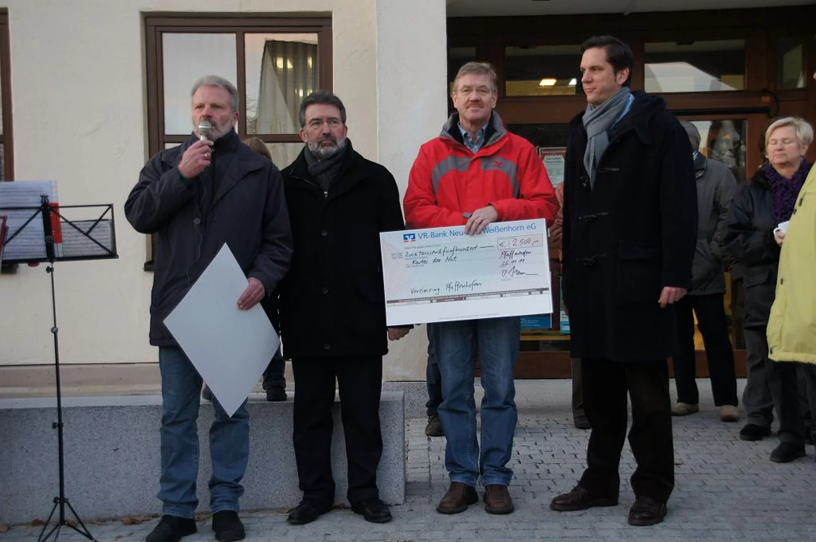 Bereits zum zweiten Mal können sich die Pfaffenhofener am adventlichen Krippenweg erfreuen. Denn auf insgesamt 32 Stationen haben die Organisatoren Leonhard Werwein, Alfons Endres und Josef Duile kunstvolle Krippen und weitere Weihnachtsmotive zusammengetragen. Zahlreiche der im Gewerbeverband zusammengeschlossenen Händler haben sich an der Aktion beteiligt. Erneut nahmen etwa 250 Teilnehmer an der Wanderung entlang der Schaufenster teil die von der Feuerwehr abgesichert wurde. Eine große Vielfalt unterschiedlichster Krippentypen konnte bestaunt werden, eine orientalische Simultankrippe, Großfiguren oder Tiki-Schnitzereien. Nicht nur Geschäfte beteiligten sich heuer, auch die Kindertagesstätte St. Martin, der Kindergarten St. Monika und die evangelische Kirche „Zum guten Hirten“. Zum Abschluss traf man sich auf dem rathausplatz um bei Glühwein und Flammkuchen auf die weitere Attraktion des Pfaffenhofener Advents zu warten, die neue Weihnachtsbeleuchtung. Entlang der südlichen Hauptstraße, dem Kirch- und dem Rathausplatz wurden um die Straßenlampen beleuchtete Sterne montiert die auf einhellige Begeisterung stießen. Möglich gemacht wurde die Beleuchtung durch die gemeinsame Anschaffung von Marktgemeinde und Gewerbeverband. Und noch etwas Erfreuliches fand bei der kleinen Adventsfeier statt, die Organisatoren des Marktlaufs, Johann Kast für die Lauffreunde Pfaffenhofen und Karlheinz Thoma für den Vereinsring konnten 2 Schecks über jeweils 2.500 € an die "Kartei der Not" und die Aktion "Pfaffenhofen hilft" übergeben.
