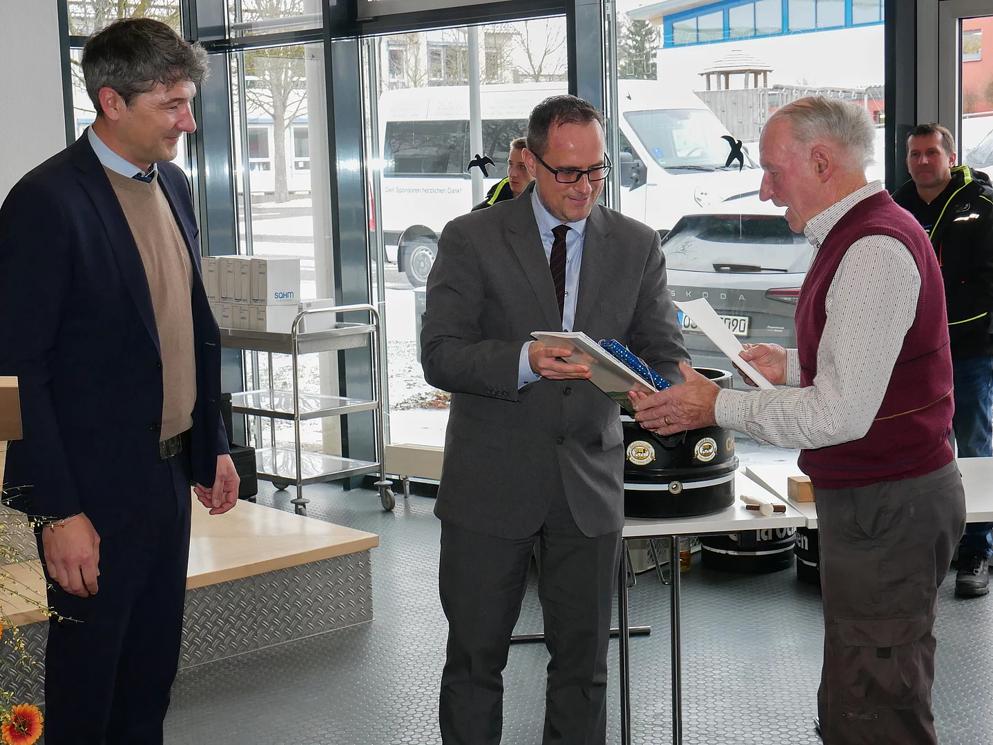 Im weiteren Verlauf des Empfangs standen Ehrungen auf dem Programm. Rudolf Werwein aus Beuren wurde für 25 Jahre aktiven Dienst als Feldgeschworener ausgezeichnet. Ulrich Fackler, Vermessungsdirektor des Amts für Digitalisierung, Breitband und Vermessung in Günzburg, berichtete in diesem Zusammenhang über das Feldgeschworenenwesen, das als immaterielles Kulturerbe anerkannt ist und auf dem sogenannten „Siebener Geheimnis“ beruht. Rudolf Werwein erhielt hierzu eine Urkunde von Finanz- und Heimatminister Albert Füracker überreicht.