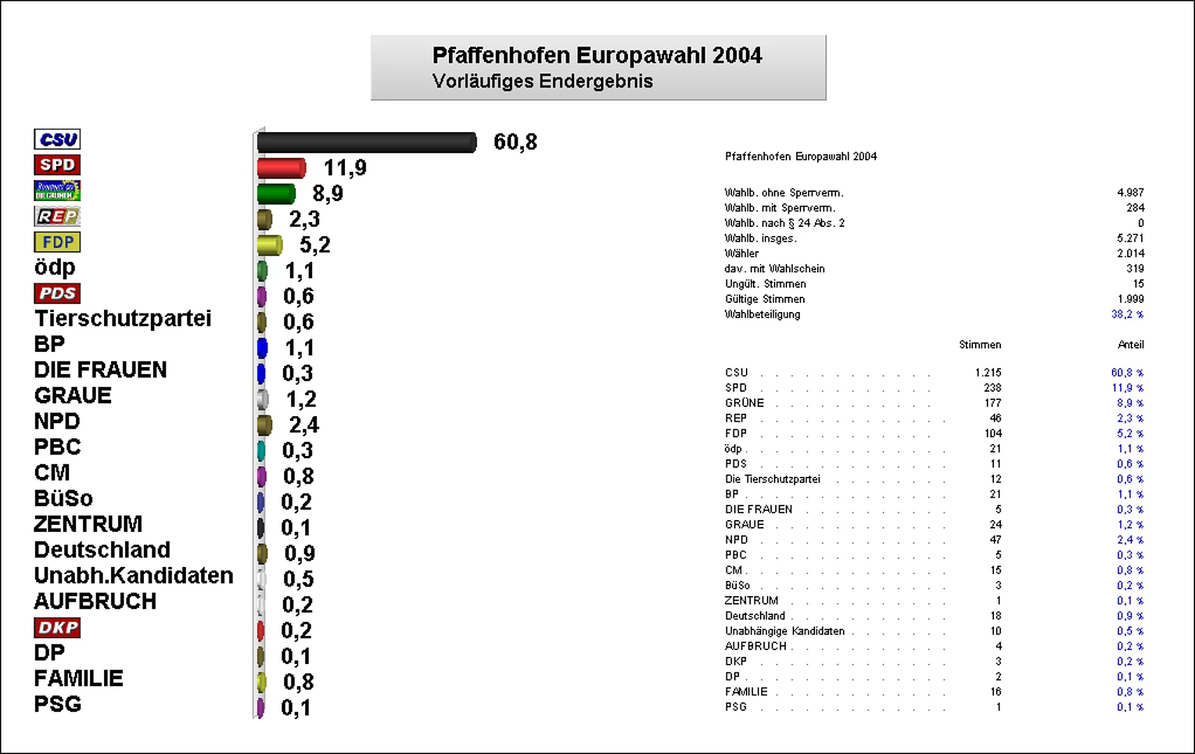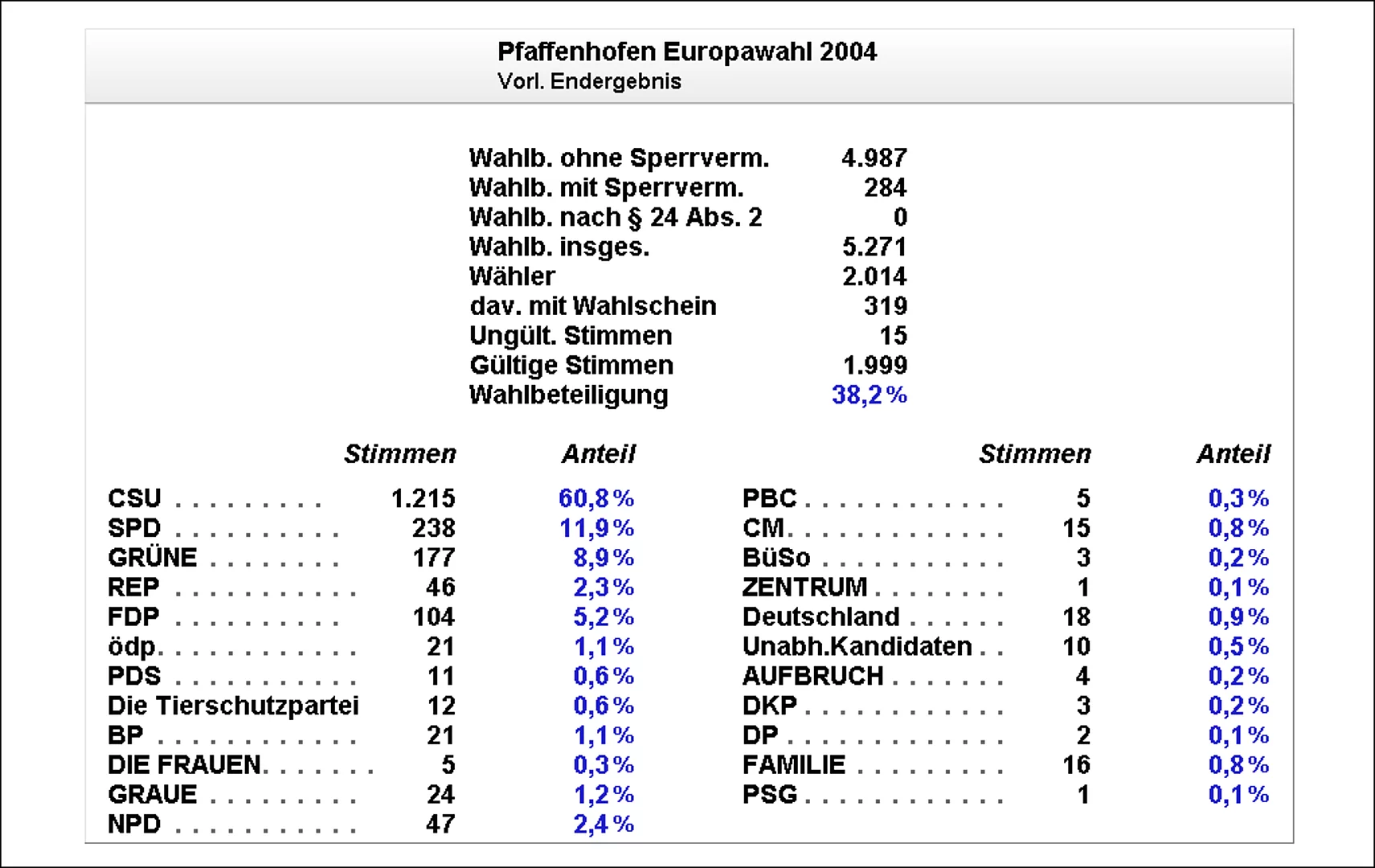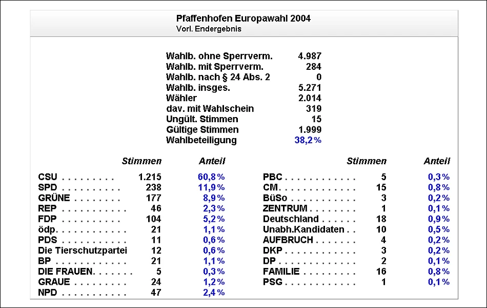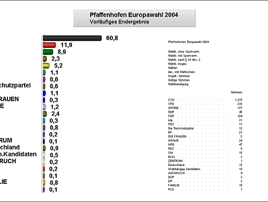 Viele Bürger Pfaffenhofens opferten ihren freien Sonntag um im Dienste der Demokratie den reibungslosen und ordnungsgemäßen Ablauf der Wahl zum europäischen Parlament zu gewährleisten. Schade war nur, dass nur etwa 38 % der Bevölkerung ihr Wahlrecht wahrnahmen und den Gang zum Wahllokal aufnahmen, bzw. per Briefwahl ihre Stimme abgaben. Mit diesem Verhalten standen die Pfaffenhofener jedoch nicht allein, das Gleiche ließ sich europaweit beobachten. Einen Vorteil hatte die geringe Wahlbeteiligung für die Wahlhelfer, die Stimmenauszählung war im Wesentlichen nach einer halben Stunde abgeschlossen und einem geruhsamen Sonntagabend stand nichts mehr im Wege.