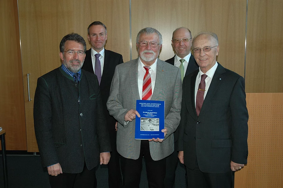 Die Keltenschanze auf der Beurer Flur „Die Schanz“ könnte eine Zentralfunktion für etwa 15 kleinere Schanzen, zum Teil mit Siedlungen, im Umkreis von rund 30 Kilometern gehabt haben. Sie sei zu groß, als dass sie allein von ihren Bewohnern hätte erbaut werden können; es müssen wohl Helfer von auswärts mit Hand angelegt haben. Diese Hypothese stellt Kreisarchäologe Richard Ambs in seinem eben erschienenen Fachbuch „Die keltische Viereckschanze bei Beuren“ auf. Darin beschreibt der Elchinger zusammen mit seinen drei Co-Autoren Karin Berghausen, Henriette Obermaier (beide München) und Stefan Reuter (Neu-Ulm) detailliert die umfangreichen archäologischen Grabungen und deren Ergebnisse. Auf die Fährte der Viereckschanze brachte die Kreisarchäologie eine Karte der Flur „Die Schanz“ von 1824, auf der die Schanzenstruktur der umliegenden Felder deutlich zu erkennen ist. Bei der Begehung des Gebiets fand Richard Ambs’ Mitstreiter Peter Wischenbarth anschließend Keramikscherben, ein kleines Bruchstück einer Tierplastik und zwei Schmuckfragmente, jeweils aus der Keltenzeit. Diese Funde gaben den Ausschlag für die Grabung. Finanziert vom Landkreis Neu-Ulm, gruben Richard Ambs und seine ebenfalls ehrenamtlichen Helfer der Kreisarchäologie sechs Sommer lang, von 1996 bis 2001, auf der Gemarkung Beuren, die heute zum Markt Pfaffenhofen an der Roth gehört. Die Einblicke, die sie dabei bekamen, sind für die Fachwelt von Pionierrang. „Die Beurer Keltenschanze ist eine der größten Schanzen, die in Deutschland bislang gefunden und untersucht wurden“, sagte Richard Ambs bei der Buchpräsentation im Landratsamt Neu-Ulm. Schon die reinen Abmessungen der Anlage sind spektakulär: Die Umwehrung der Viereckschanze war rund 640 Meter lang; der von einem Graben mit einer Tiefe von bis zu 2,80 Meter und einem mehr als 2,50 Meter hohen Wall umschlossene Innenraum misst 2,7 Hektar. Nach den Berechnungen der Archäologen mussten dafür von den Erbauern rund 5.250 Kubikmeter Erde bewegt werden. „Wahrlich eine gewaltige Gemeinschaftsleistung, welche sicher nur durch eine größere Zahl von Arbeitskräften zu bewerkstelligen war“, schreibt Richard Ambs. Er schätzt, dass viele der Helfer aus mehreren Keltensiedlungen im Umkreis gekommen sind. Das entspricht in etwa der Distanz, die ein Mensch in einem Tagesmarsch zurücklegen kann. Auch das Eichenholz, aus dem die Kelten ihre Gebäude errichteten, hätten die Bewohner der Beurer Schanze unmöglich alleine beschaffen können, so Ambs. Anhand der ausgegrabenen Fundstücke – vor allem Keramikscherben, viele Schweineknochen, zudem verkohlte Holzrückstände, Mahl- und Wetzsteinfragmente, einige Eisenobjekte und ein gläsernes Armreiffragment – konnte die Besiedlungszeit der Keltenschanze auf ungefähr 150 bis 50 vor Christus bestimmt werden. Auf der Beurer Flur fanden Ambs & Co. Im Schanzenbereich aber auch menschliche Spuren aus weit früheren Epochen: aus der Münchshöfener Kultur (um 4.300 vor Christus), aus der Glockenbecherkultur (um 2.200 vor Christus) und aus der Bronzezeit (um 1.400 vor Christus). Zurück zu den Kelten: „Bislang einmalig“ sind Ambs zufolge auch die Anzahl und Dimensionen der vormaligen Gebäude in der Beurer Viereckschanze. In der Mitte der Ostseite habe sich einst der durch einen Torbau geschützte Eingang zu der Anlage befunden. Vier Großbauten, davon drei mit über 200 Quadratmeter Grundfläche, ein Grubenhaus, zwei Getreideharfen sowie sieben gestelzte Speicherbauten dürften zeitgleich bestanden haben. Bei einem großen Gebäude nahe der Südwestecke der Schanze könnte es sich um einen Kult- oder Versammlungsbau gehandelt haben. Nach Auffassung des Kreisarchäologen weist die Keltenschanze bei Beuren also Merkmale beider Theorien auf, die gegenwärtig in der Wissenschaft um die Vorherrschaft ringen. Unter baden-württembergischen Archäologen gelten die Viereckschanzen vornehmlich als landwirtschaftliche Gutshöfe, während die bayerischen Berufskollegen überwiegend der Überzeugung sind, es handele sich dabei um kultische Anlagen. Dieser Meinungsstreit konnte bislang weder in die eine noch in die andere Richtung entschieden werden, weil für die meisten der über 300 bekannten Viereckschanzen keine oder nur spärliche Untersuchungen vorliegen. Anders jetzt im Fall Beuren: Nach Angaben von Richard Ambs ist diese Keltenschanze die bislang einzige im Regierungsbezirk Schwaben, die man vollständig archäologisch untersucht hat. Bei der nun darüber vorliegenden Monographie handele es sich sogar um die erste größere wissenschaftliche Einzeldarstellung über eine komplett analysierte Ausgrabung in Bayern. Landrat Erich Josef Geßner würdigte die vierte Publikation der Schriftenreihe „Berichte zur Archäologie im Landkreis Neu-Ulm und in den angrenzenden Gebieten“ als „wichtigen Beitrag zur Dokumentation und Bewahrung des keltischen Erbes im Landkreis Neu-Ulm im Allgemeinen und des Marktes Pfaffenhofen an der Roth im Besonderen“. Das Fachbuch von Richard Ambs u. a. über die keltische Viereckschanze bei Beuren, für dessen Herstellkosten neben dem Landkreis Neu-Ulm die Volksbank Neu-Ulm als Sponsor aufkommt, ist über das Landratsamt Neu-Ulm zum Stückpreis von 45 Euro zu beziehen. Bestellen kann man Band 4 – wie alle vorangegangenen Bände – am einfachsten über den Internetauftritt des Landkreises Neu-Ulm. Die Webadresse lautet: www.landkreis.neu-ulm.de. Auf der Homepage ist dann dem Rubrikenpfad Bürgerservice/Publikationen/Bücher zu folgen.