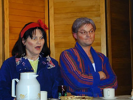 Umwerfend in Mimik und Gestik sind Maria Störk und Christoph Schlander im Sketch "Du hasch a Glück". Da der Zug Verspätung hat, ist genug Zeit für Emma ihrem Rudolf noch mal haarklein aufzuzählen, was in ihrem einwöchigen Urlaub von ihm alles zu erledigen sei. Waldemar ausführen, selbst wenn er gar nicht muss, den Wellensittich führen, die Beeren brocken, Holz machen, Gartenzaun richten, die Liste nimmt kein Ende. Dabeihat er so ein Glück, er kann sich die Arbeit ja frei einteilen.