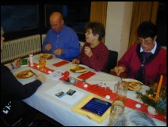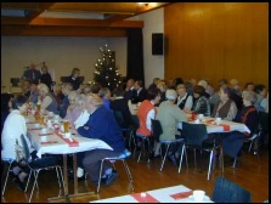 Geschichte vom Vater und den 3 Söhnen. Ein Vater hatte drei Söhne, schon zu Lebzeiten wollte er wissen wer seinen Besitz erhalten solle. Deshalb gab er seinen Kindern den Auftrag, die große Scheune mit wenigst wenig Kosten komplett auszufüllen. Der 1. kaufte alles leere Stroh und füllte die Halle. Der 2. kaufte alle Sägespäne und füllte die Halle. Der dritte wartete bis es dunkel geworden war lud den Vater in die Scheune ein und stellt eine Kerze in die Scheune, entzündete sie und nach ein paar Minuten hatte sich die ganze Scheune mit Licht erfüllt. Somit erhielt der 3 Sohn den ganzen Besitz. Licht und Liebe sind das einzige was mehr wird, wenn man es teilt. Teilen wir mit dem Licht des Adventskranzes und an Weihnachten mit dem Licht des Christbaumes die Liebe, die uns Gott in seinem Sohn Jesus Christus geschenkt hat. Der Vereinsringvorsitzende Karlheinz Thoma trug eine heitere Geschichte mit dem Titel "Ein Paar Schlittschuhe" vor, die so lustig war, dass er selbst stellenweise vor Lachen nicht weiterlesen konnte. Hans Kast folgte noch mit dem gekonnten Vortrag der "Grädige Weihnachta" von Klaus Maucher. Dann war die Zeit für die große Tombola gekommen, die von den örtlichen Betrieben mit großzügigen Geschenken ausgestattet worden war. Nachdem sie noch mit einem Paar Bratwürsten mit Kartoffelsalat bewirtet worden waren, gingen die Senioren zufrieden nach Hause.