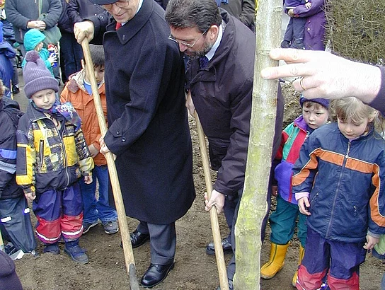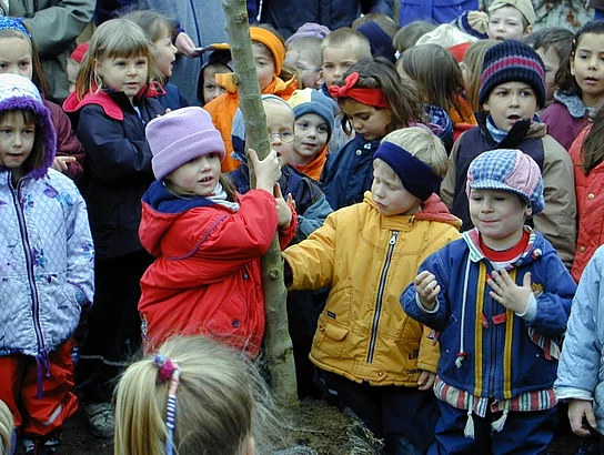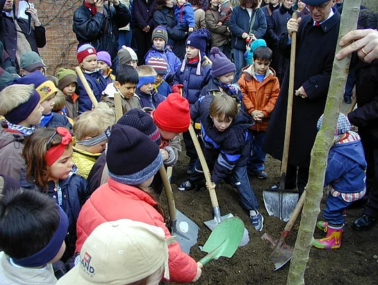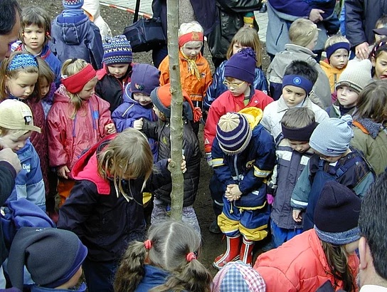 Mit einem Lied und einem Gedicht passend zum Thema Apfel begrüßten die rund 100 Kinder die zahlreichen Gäste, die sich aus Anlass des "Tag des Baumes" im Kindergarten St. Martin eingefunden hatten. Im Anschluss durften sie selber zur Schaufel greifen, um ihren neuen Apfelbaum unter fachgerechter Anleitung einzupflanzen. Zur Belohnung erhielt jeder vom Landrat einen knackigen Apfel.