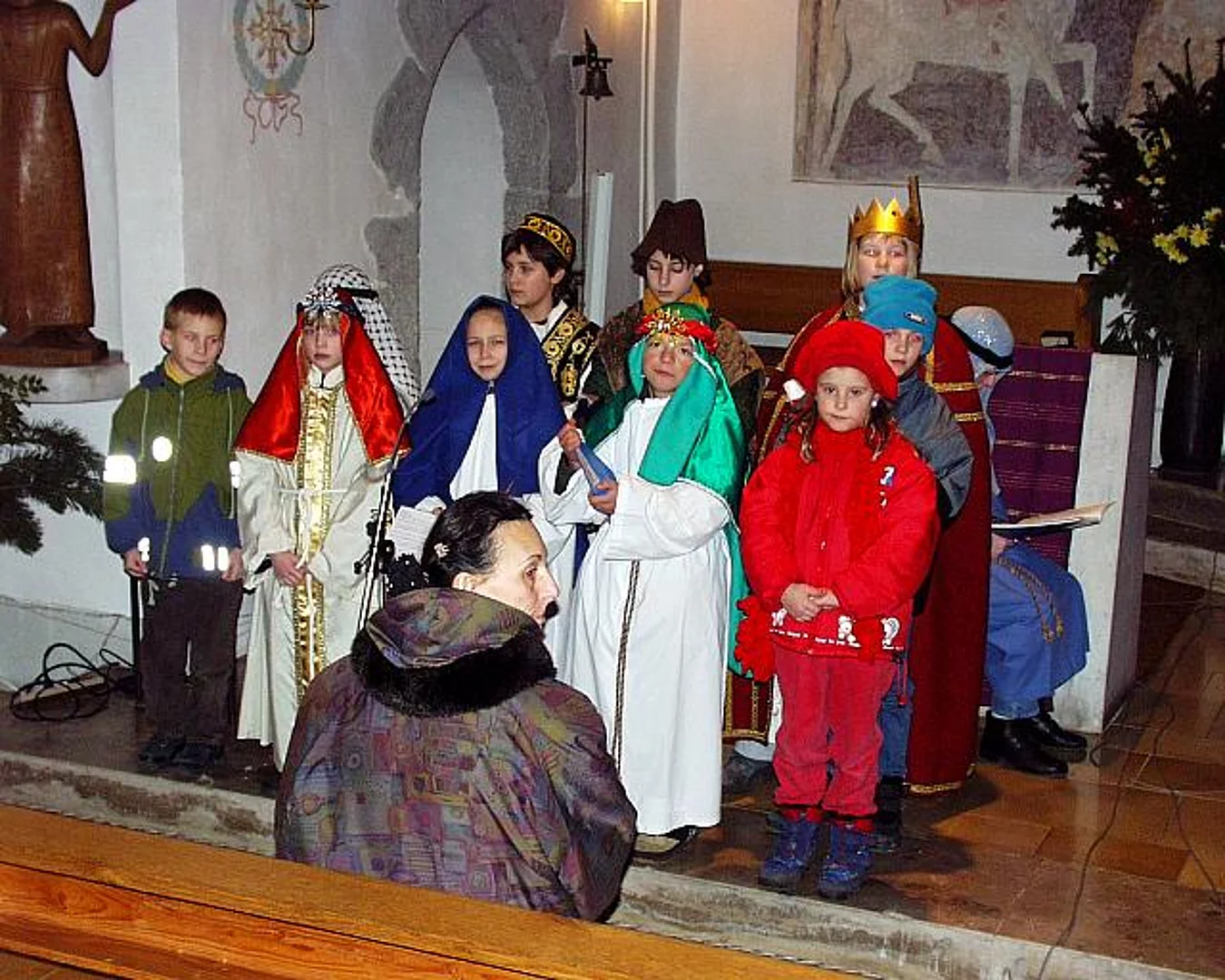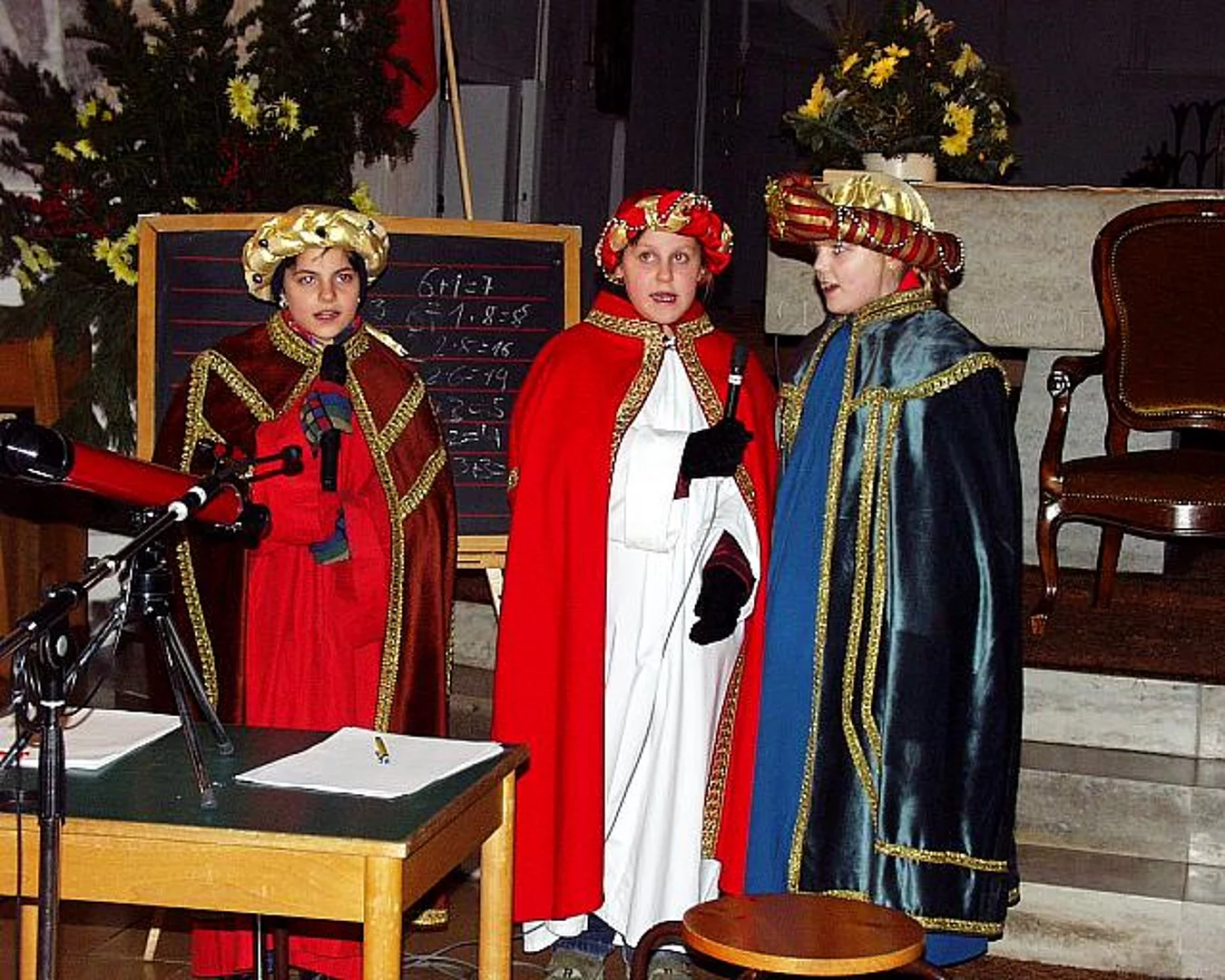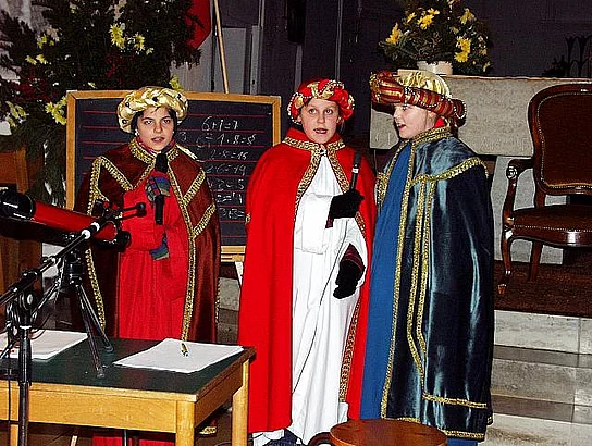 Ausgehend von den Beobachtungen der Sterndeuter aus Babylon entwickelte sich das Spiel bis zur Ankunft der Sterndeuter im Stall von Betlehem. Die Aufregung am Palast des Königs Herodes wurde für jeden nachvollziehbar. Ein besonderer Blickpunkt war das Kamel, das die Geschenke für das Kind im Stall tragen durfte. Die 25 Sänger und Schauspieler wurden von Orgel und Querflöte begleitet. Die Melodien waren so eingängig, daß mancher bei der 2. Strophe mitsummte oder sogar mitsang. Den kleinen Künstlern (ca. zwischen 8 und 12 Jahren) und allen Helfern darf zu den gelungenen Aufführungen gratuliert werden.